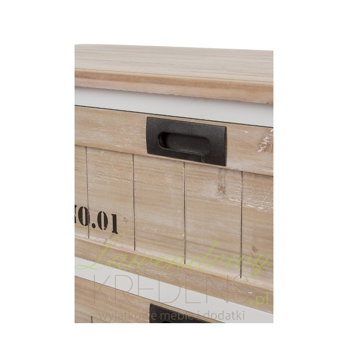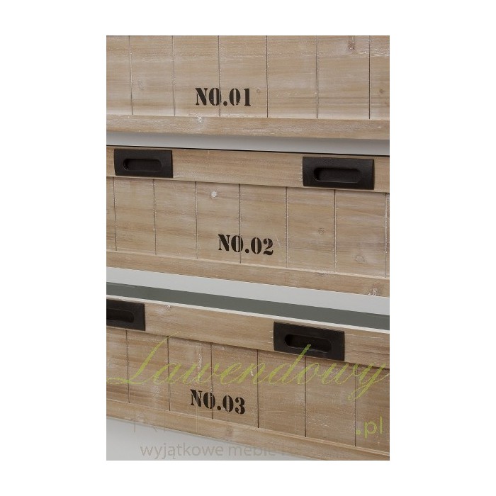 Biało-brązowe komody prowansalskie które mają specjalnie ponumerowane szuflady. Ich nowoczesny design, wynikający z połączenia bieli obudowy i bielonego drewna szuflad oraz czarnych napisów to zabieg pozwalający przemycić świetne meble w stylu prowansalskiem nawet do dziecięcego pokoju!