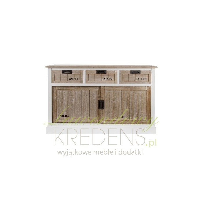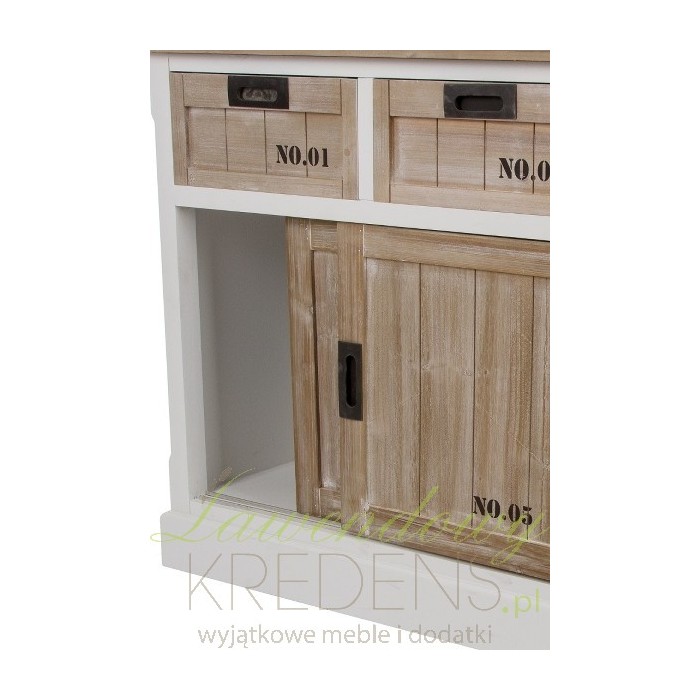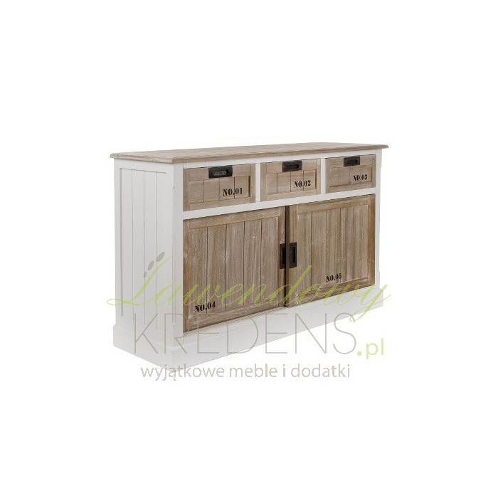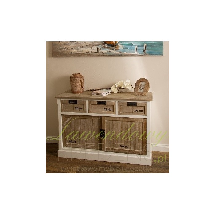 Komoda prowansalska z numerami wyposażona jest w pojemną szafkę i trzy szuflady, które zapewniają odpowiednią ilość miejsca do przechowywania, z kolei obszerny blat będzie wspaniałym miejscem, by ustawić na nim dekoracje takie jak wazony z kwiatami lub ramki na zdjęcia. Ta duża komoda w stylu prowansalskim jest nie tylko doskonałym meblem ale również piękną ozdobą dla klimatycznego wnętrza. Komoda z numerami wykonana została z połączenia białego korpusu mebla z bielonymi elementami w kolorze brązowym. Będziesz zachwycony ilością przestrzeni do zagospodarowania i klasycznym wyglądem mebla!