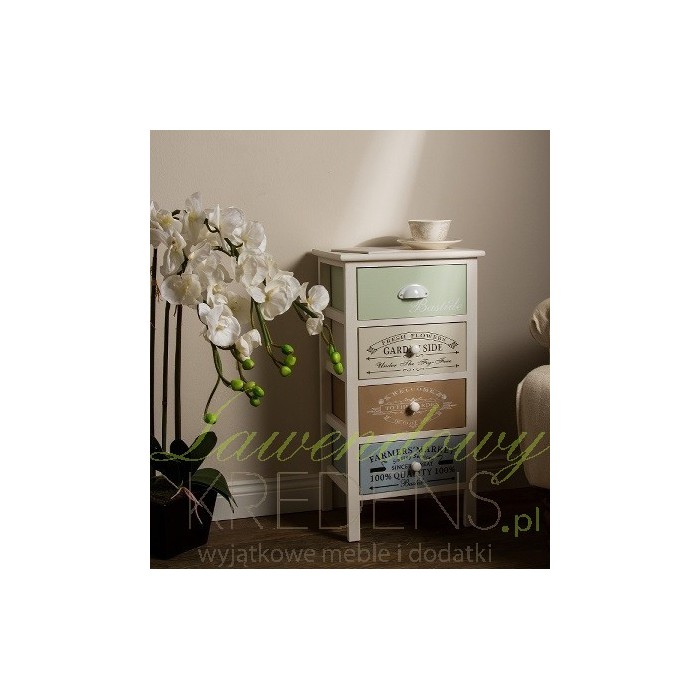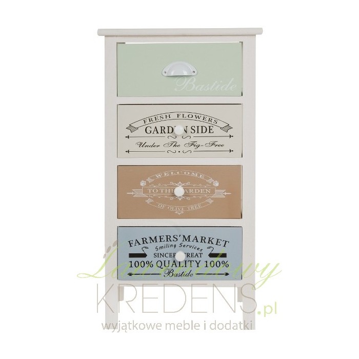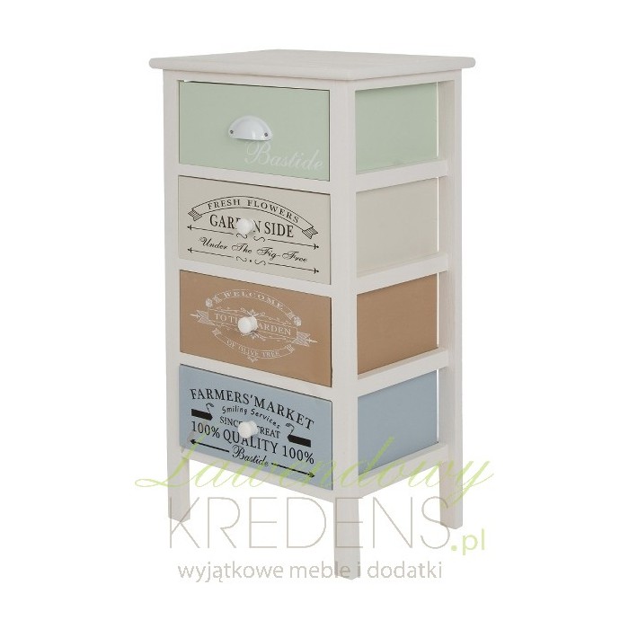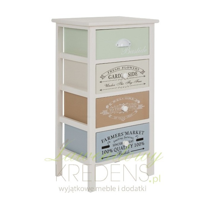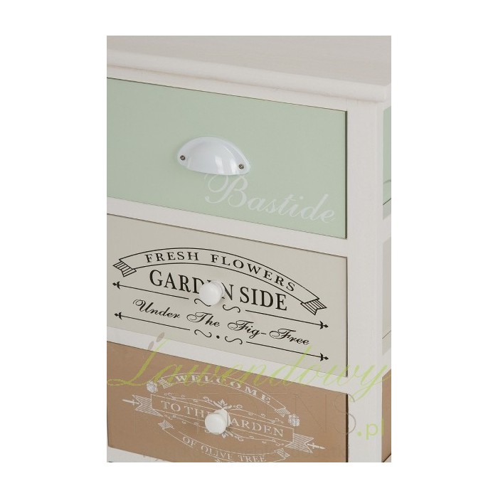Biała szafka z kolorowymi szufladami to doskonałe rozwiązanie, dzięki któremu dodasz koloru swoim czterem ścianom. Każda z szuflad ma inny kolor i jest dodatkowo ozdobiona napisami od przedniej strony - białymi na miętowym i brązowym froncie oraz czarnymi na froncie beżowym i niebieskim. Dolne szuflady posiadają drewniane, okrągłe uchwyty, natomiast górna szuflada ma uchwyt metalowy w starym stylu.