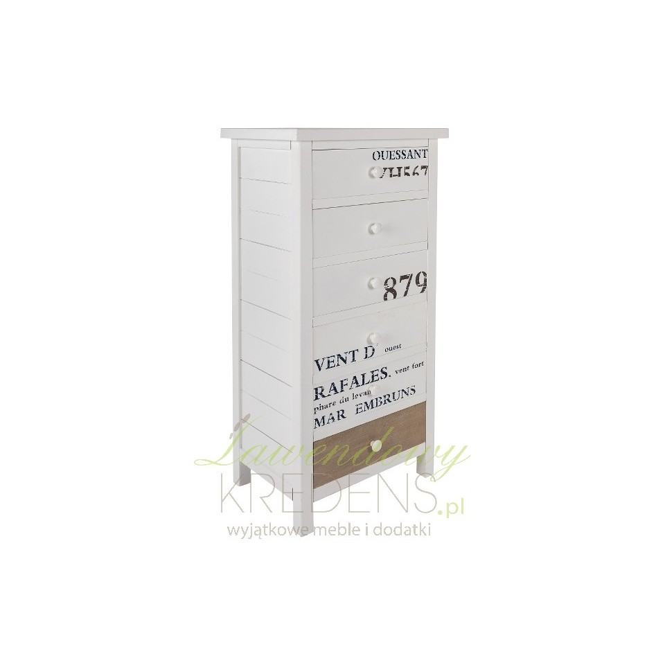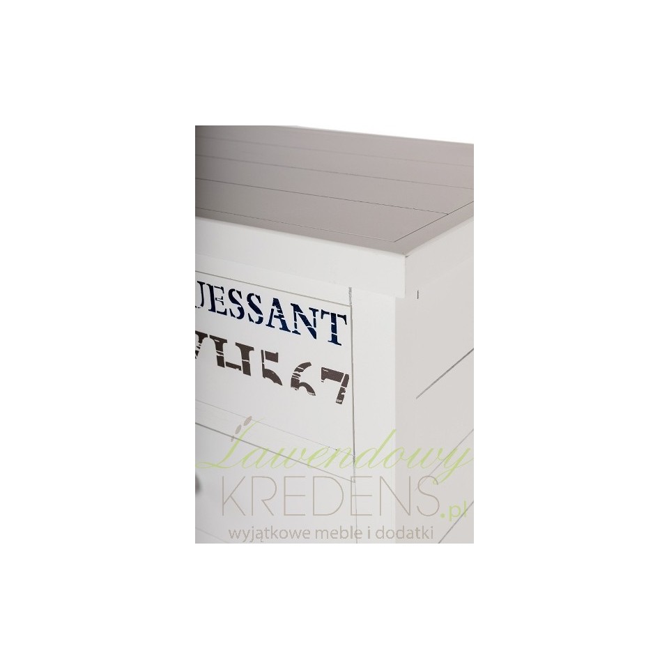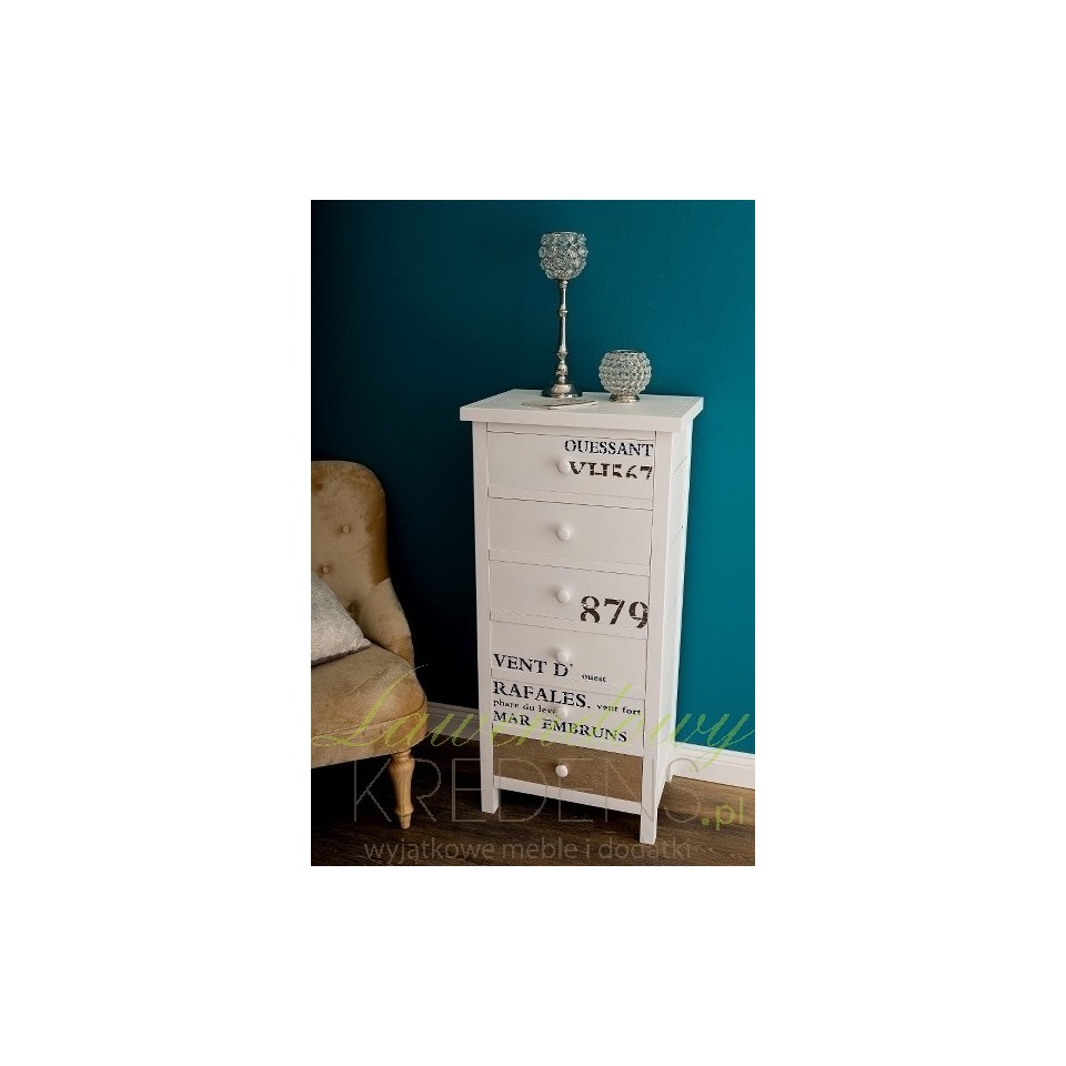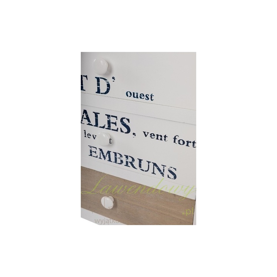 Biała komoda wykonana z drewna wyposażona w sześć wygodnych szuflad z uchwytami w postaci kuleczki, stanowi uroczy mebel o dość nowowcześnie wyglądających zdobieniach. Na powierzchni czterech z pięciu białych szuflad umiejscowiono napisy o różnej czcionce i kolorze. Ostatnia, dolna szuflada odstaje od całości z racji na swoją brązową, ciepłą barwę. Białe meble w stylu marynistycznym - zobacz wszystkie!