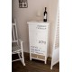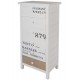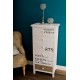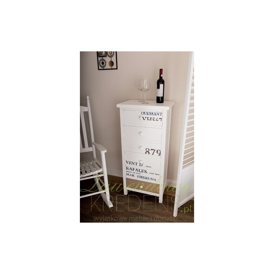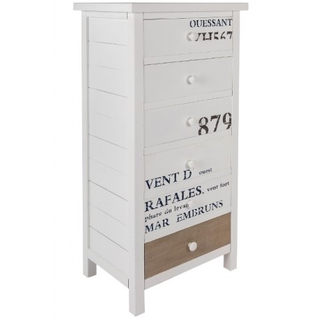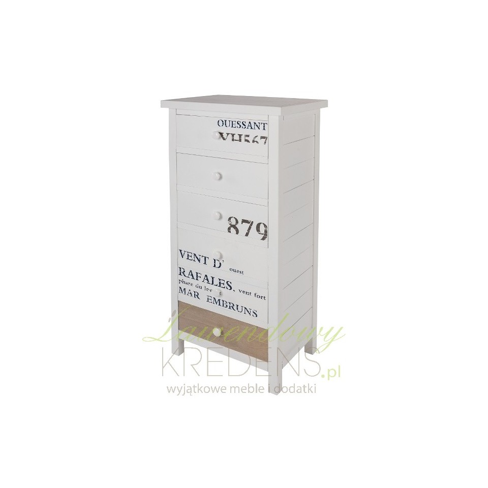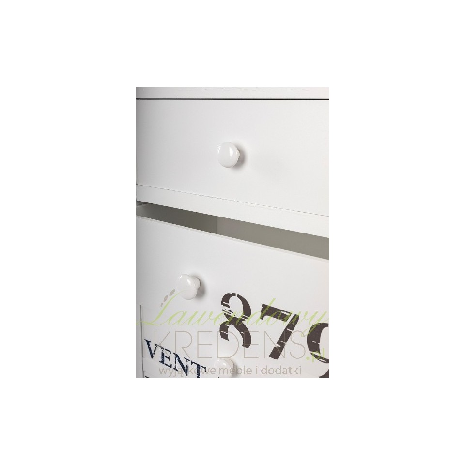 Biała komoda wykonana z drewna wyposażona w sześć wygodnych szuflad z uchwytami w postaci kuleczki, stanowi uroczy mebel o dość nowowcześnie wyglądających zdobieniach. Na powierzchni czterech z pięciu białych szuflad umiejscowiono napisy o różnej czcionce i kolorze. Ostatnia, dolna szuflada odstaje od całości z racji na swoją brązową, ciepłą barwę. Białe meble w stylu marynistycznym - zobacz wszystkie!