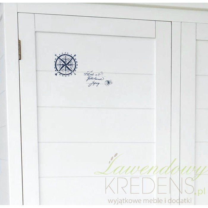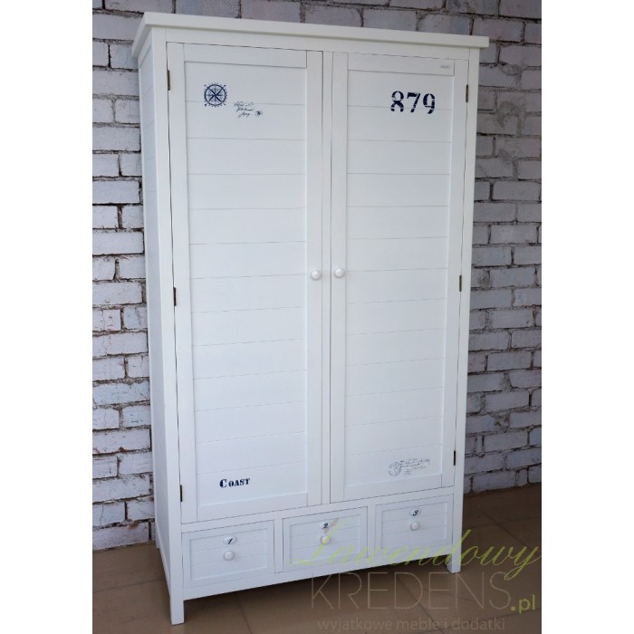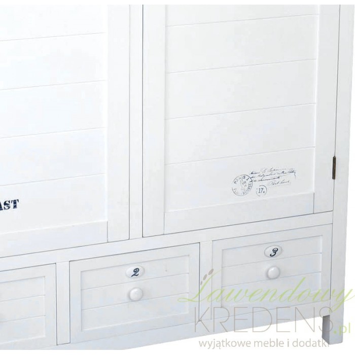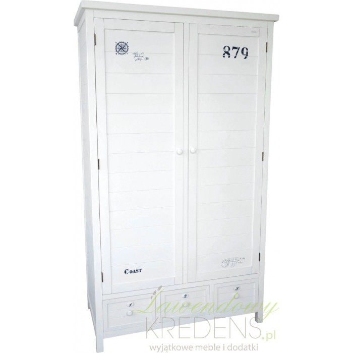 Biała szafa z parą drzwi została zbudowana z dobrej jakości drewna paulownia. W dolnej części mebla znajdują się trzy szufladki wykończone ładnymi gałkami. Całość ozdobiono motywami marynistycznymi w granatowej barwie np. stemplem z kotwicą, numerami, napisami. Białe meble prowansalskie wyglądają niezwykle szykownie i uniwersalnie. Zachęcamy!