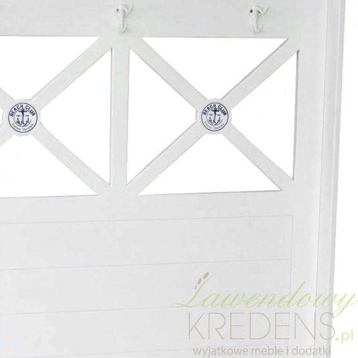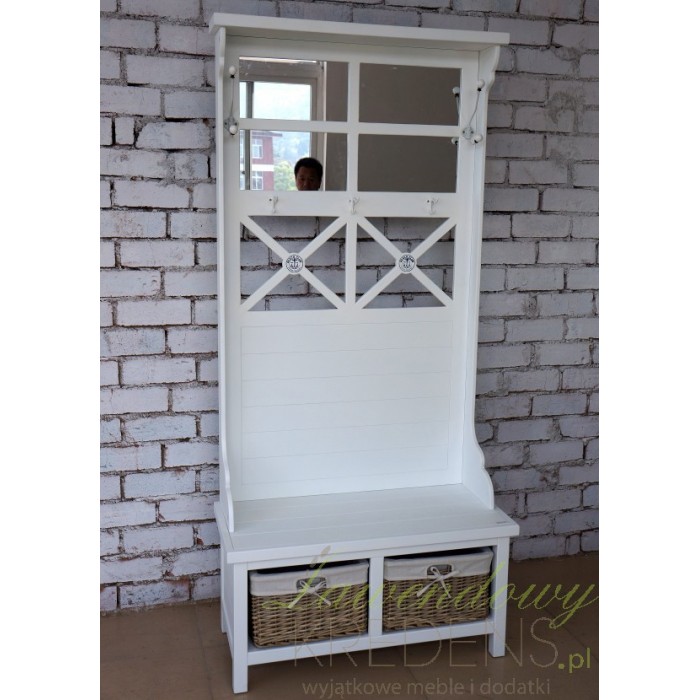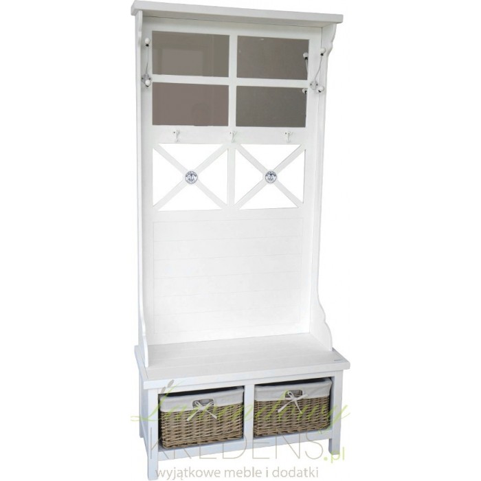 Piękna szafka do przedpokoju Marina to niesztampowy mebel, wyposażony w dwa wiklinowe kosze u dołu - idealne na drobiazgi. Szafka posiada też blacik, na którym możesz swobodnie usiąść oraz cztery małe lustra, co pozwala nie tylko komfortowo założyć buty ale także ładnie ułożyć nakrycie głowy. Szafka jest naprawdę zachwycająca a jej zdobienie w postaci wycięć nadaje jej iście wyjątkowego charakteru. Białe meble Marina - polecamy!