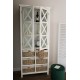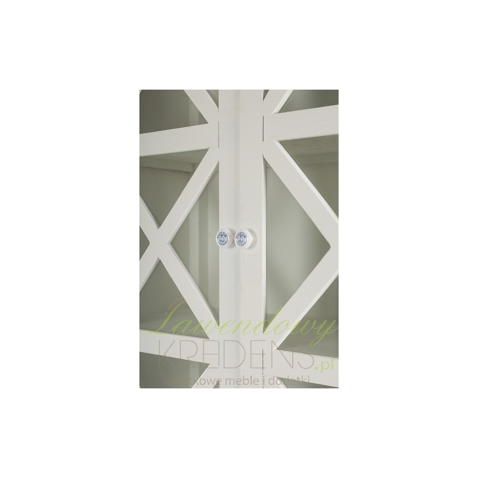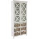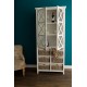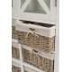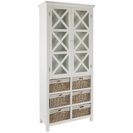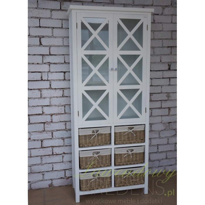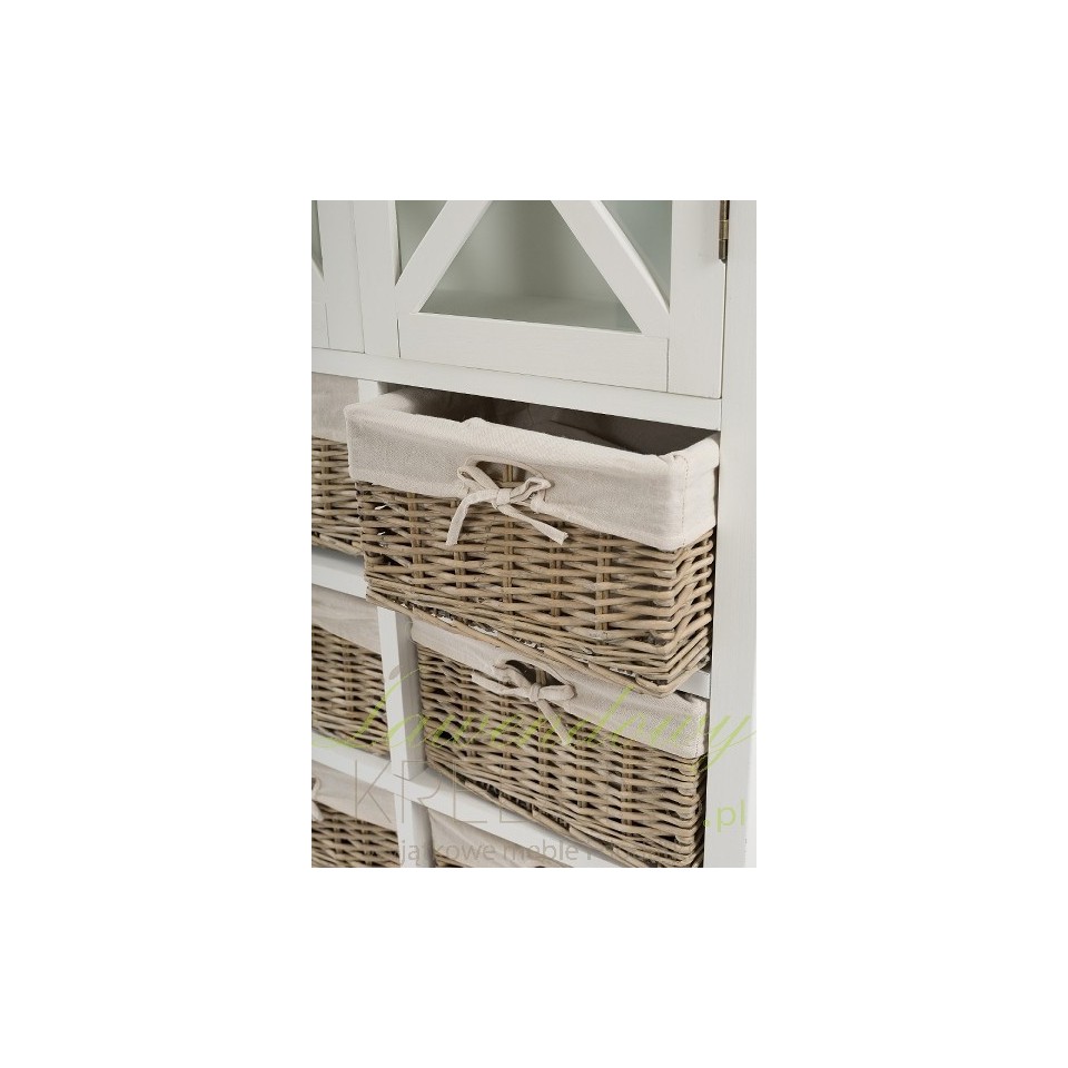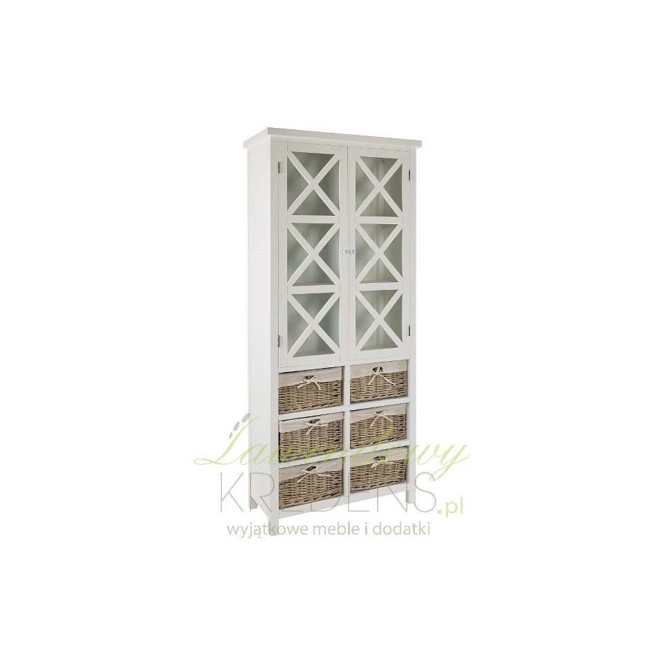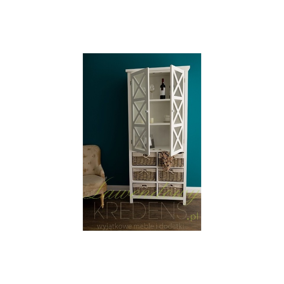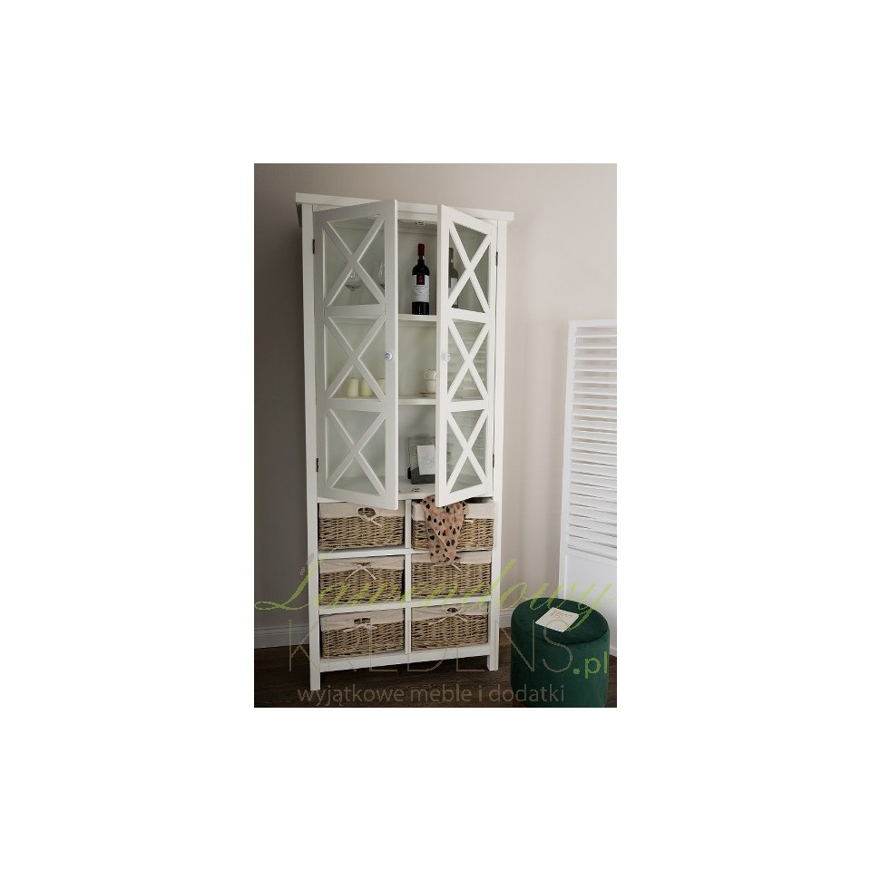Wysoka, biała witryna wykonana z drewna paulownia to wyjątkowy mebel łączący w sobie klasykę i ciekawe, dość nowatorskie rozwiązania. W górnej części znajdują się trzy wygodne półeczki zamknięte za gustownymi drzwiczkami przepasane ładnym krzyżowaniem. W dolnej części zaś, poukładano sześć wiklinowych pudełek z wstążeczkami. Mebel wygląda zachwycająco! Białe meble prowansalskie - polecamy!