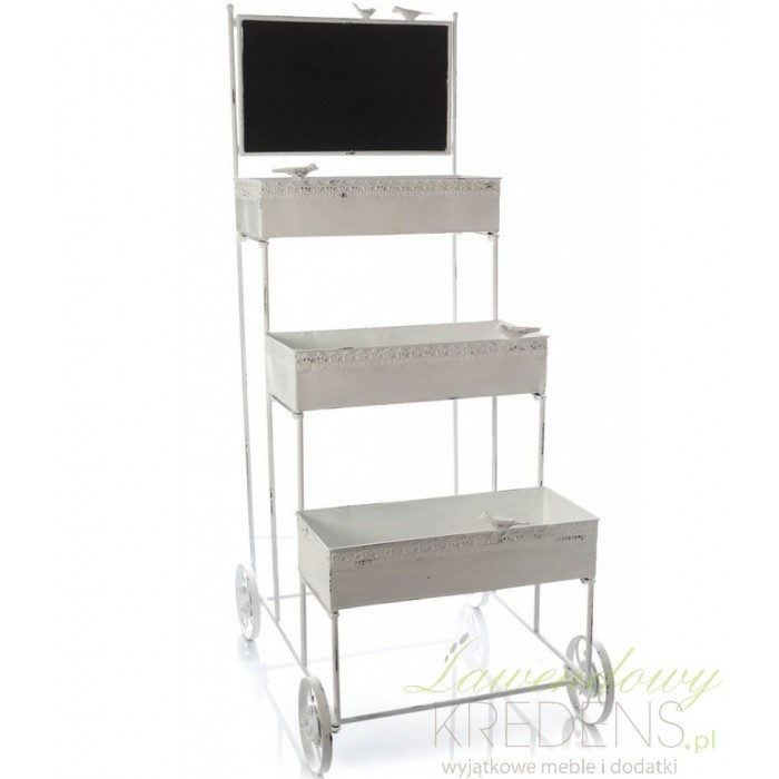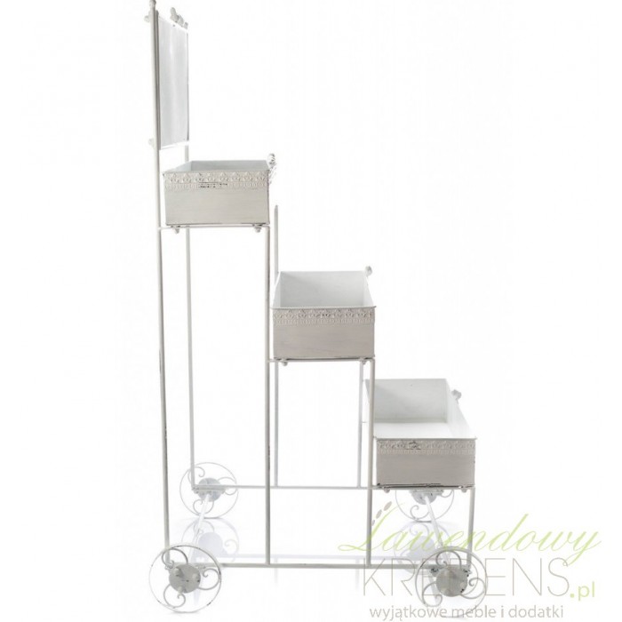 Biały kwietnik w stylu prowansalskim został wyposażony w trzy osłonki, w których możesz umieścić doniczki z kwiatami. Zarówno osłonki, jak i cała konstrukcja została poddana zabiegom odpryskiwania farby, co nadaje całości prowansalskiego charakteru. Kwietnik Aluro posiada cztery kółeczka, dzięki którym w łatwy sposób przetransportujesz swoje kwiaty. Kwietnik w stylu prowansalskim - polecamy!