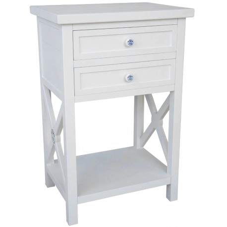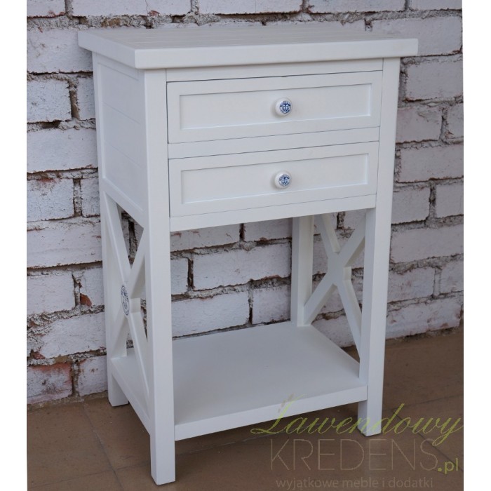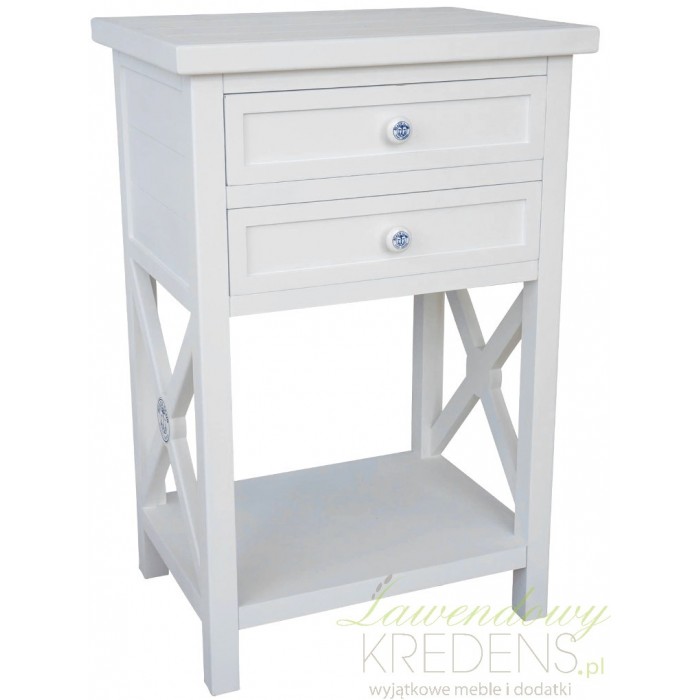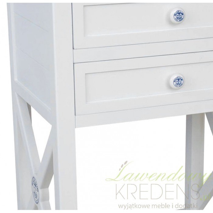 Urocza szafka w stylu marynistycznym została ozdobiona ładnymi wycięciami na bocznych ściankach oraz rysunkiem kotwicy w kolorze granatowym. W górnej części mebla umieszczono dwie szuflady z poręcznymi gałkami, w dolnej natomiast pozostawiono miejsce do zagospodarowania zamieszczając jedynie ładną półeczkę. Białe meble w stylu marynistycznym - skompletuj cały zestaw!