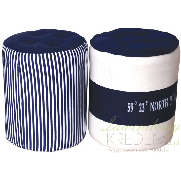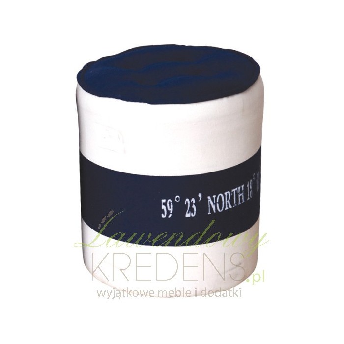 Zabawny puf w stylu marynistycznym to wygodne siedzisko w kształcie walca w granatowych i białych barwach.