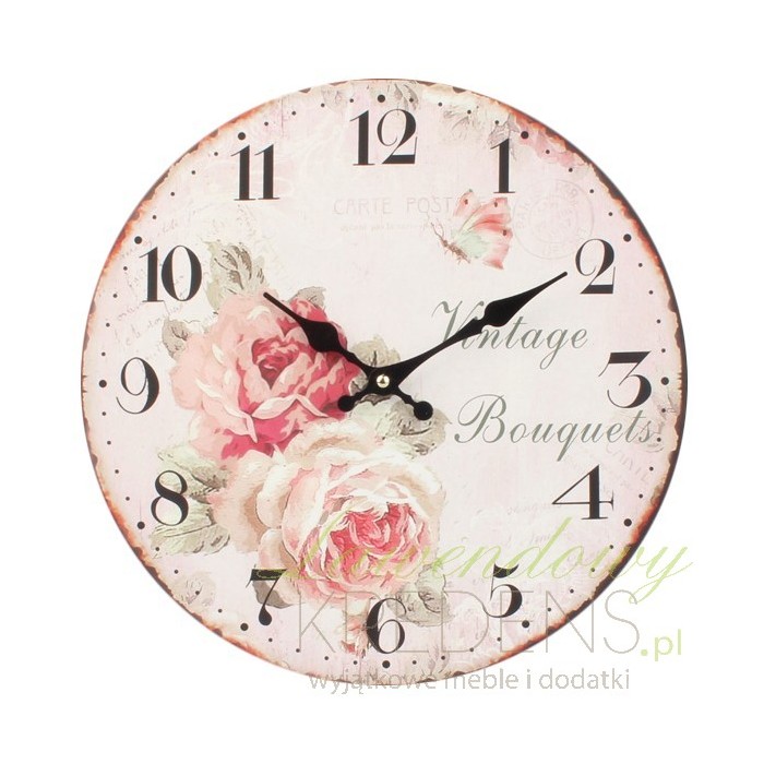 Zegary ścienne w stylu prowansalskim to urocze przedmioty o pięknych zdobieniach w postaci kwiatów o płatkach w kilku odcieniach różu.