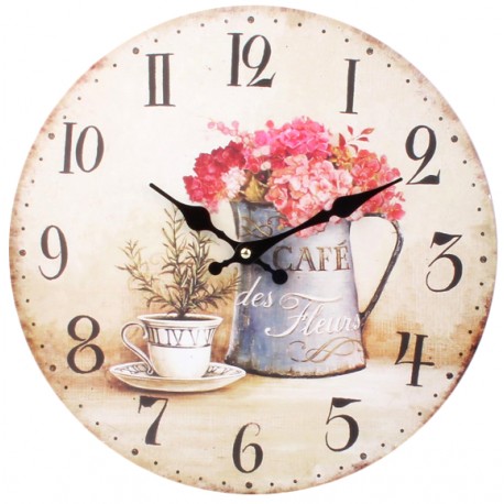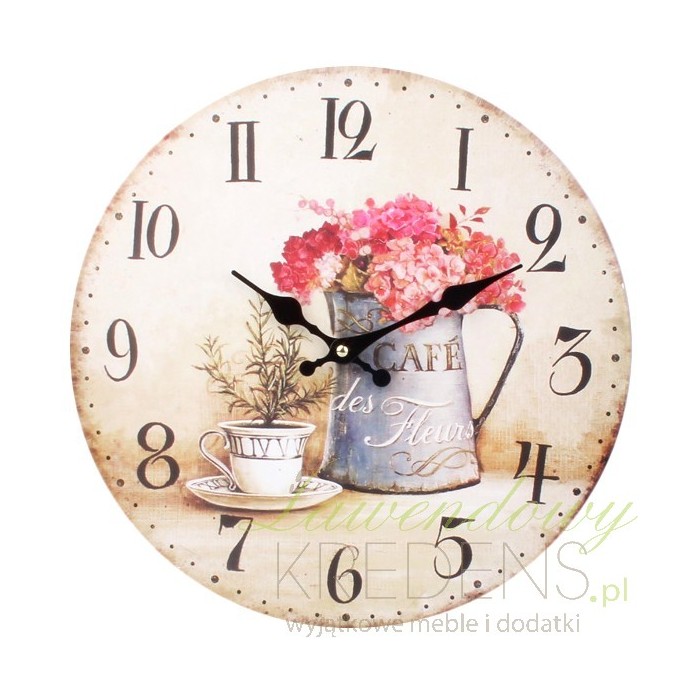 Okrągłe zegary prowansalskie to przedmioty przeznaczone do powieszenia na ścianę. Te urocze czasomierze wyposażone są w ładnie wykrojone wskazówki o czarnym kolorze. Zegar jest utrzymany w jasnych barwach a na jego tarczy widnieje niebieska konewka z napisami, w której umieszczono różowe kwiaty. Po lewej stronie znajduje się filiżanka z ornamentem w postaci rzymskich cyfr. Obejrzyj inne dodatki w stylu prowansalskim!
