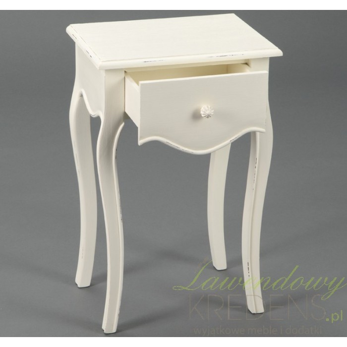Niewielkich rozamirów stoliki nocne w kolorze jasnokremowym, która została dodatkowo podkreślona bardzo delikatnymi przetarciami przy krawędziach. Swobodnie wysuwana szufladka z uroczą gałką nadaje stolikowi francuskiego charakteru, przez co mebel staje się bardziej stylowy.