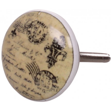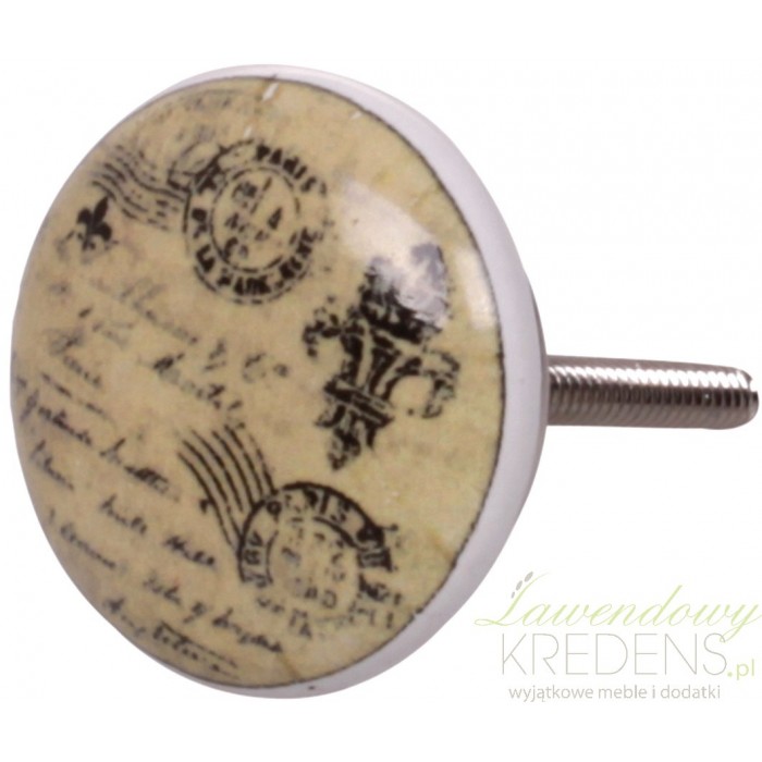 Ceramiczne gałki do mebli Chic Antique w kształcie koła zostały opatrzone wygodnym wkrętem z metalu. Zdobienia gałek stanowią rysunki związane z pocztówkami: znaczki, stemple i napisy. Wszystko zostało umieszczone na uniwersalnym, beżowym tle. Piękne!