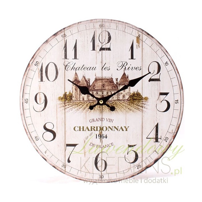 Drewniany a więc ekologiczny zegar francuski stanowi ciekawą ozdobę z ładnie naniesionymi, czytelnymi liczbami i cyframi. Na powierzchni tarczy zamieszczono rysunek zamku oraz napisy. Całość prezentuje się bardzo korzystnie a jasne tło sprawia, że pasuje do wszystkich pomieszczeń. Zegary ścienne prosto z Francji!
