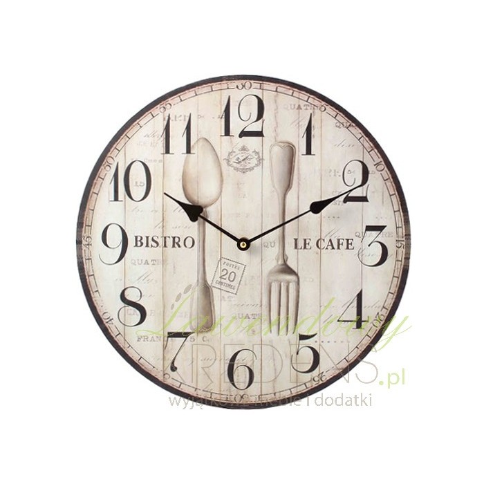 Okrągły zegar sztućce to produkt utrzymany w stylu retro. Na jego tarczy umieszczono wizerunek łyżki i widelca oraz napisy. Cyfry i liczby są bardzo czytelne a wskazówki piękne wycięte. Polecamy inne zegary ścienne z prowansalskiej kolekcji - są naprawdę boskie!