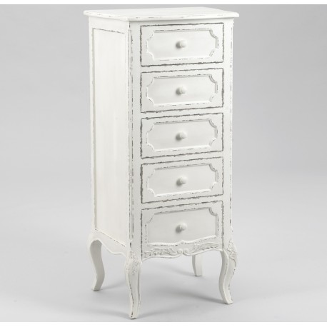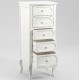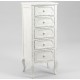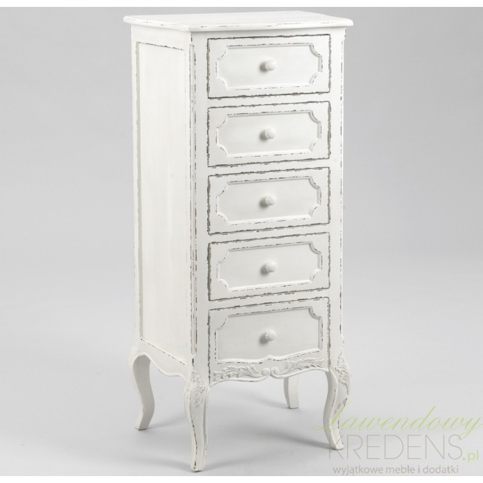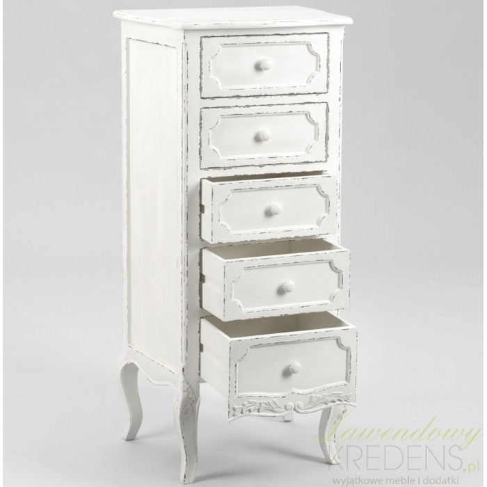 Wysokie, choć wąskie komody francuskie w kolorze antycznej bieli, stylowo ozdobiono wypukłymi elementami dekroacyjnymi na nogach i na frontach szuflad. Dodatkowo, zauważalne gołym okiem przetarcia, które wyjątkowo postarzają komodę, są wspaniałym odzwierciedleniem stylu francuskiego.