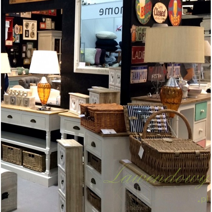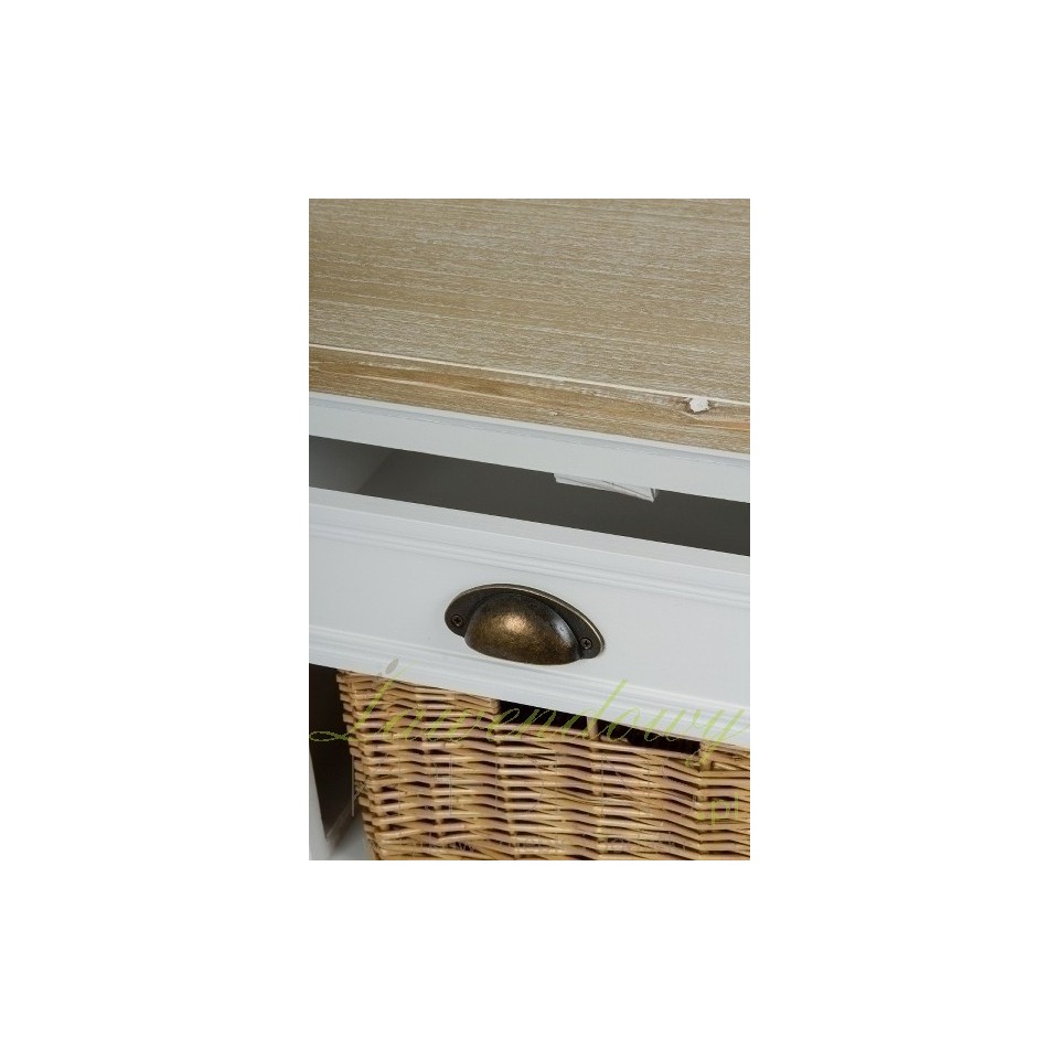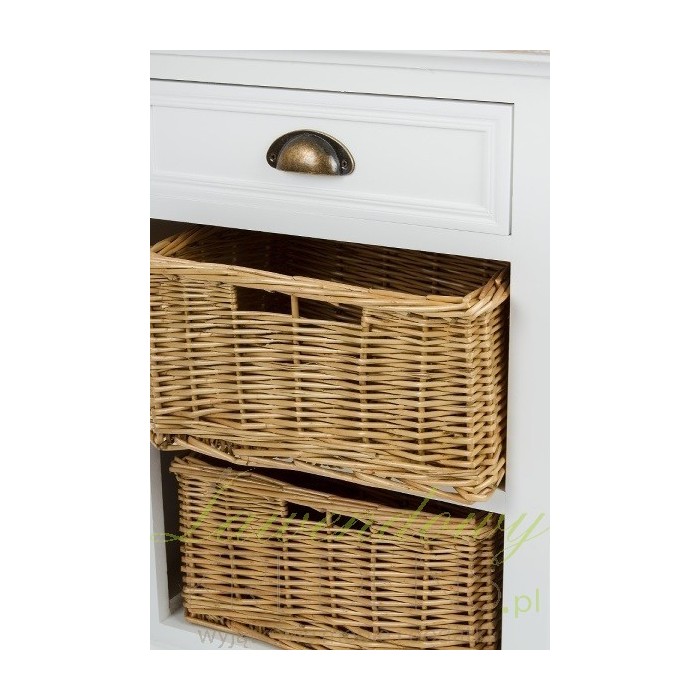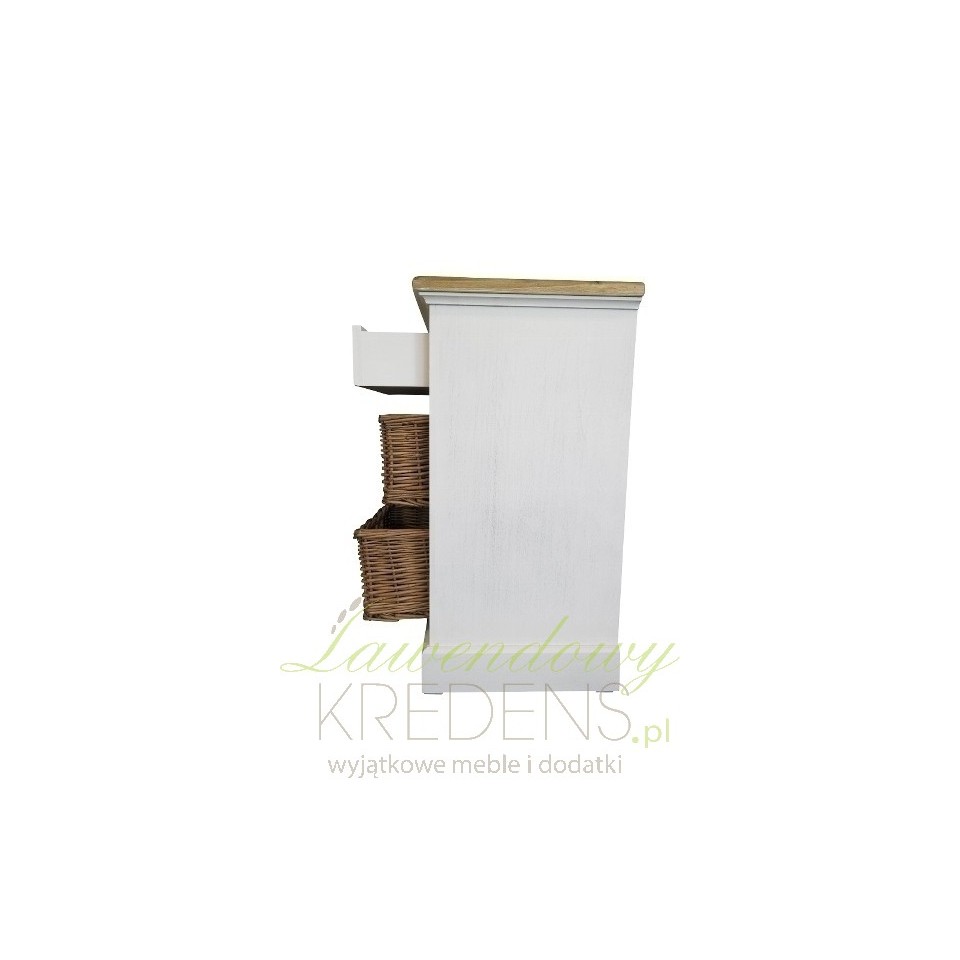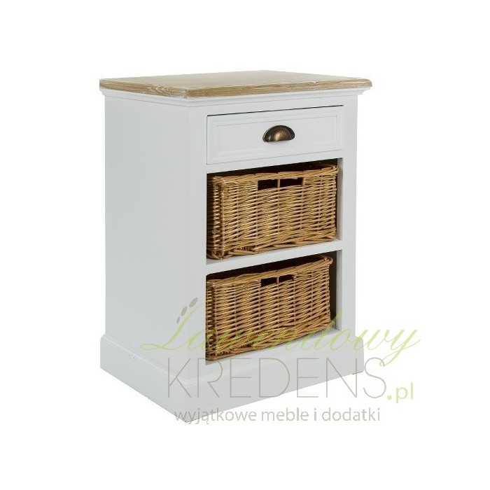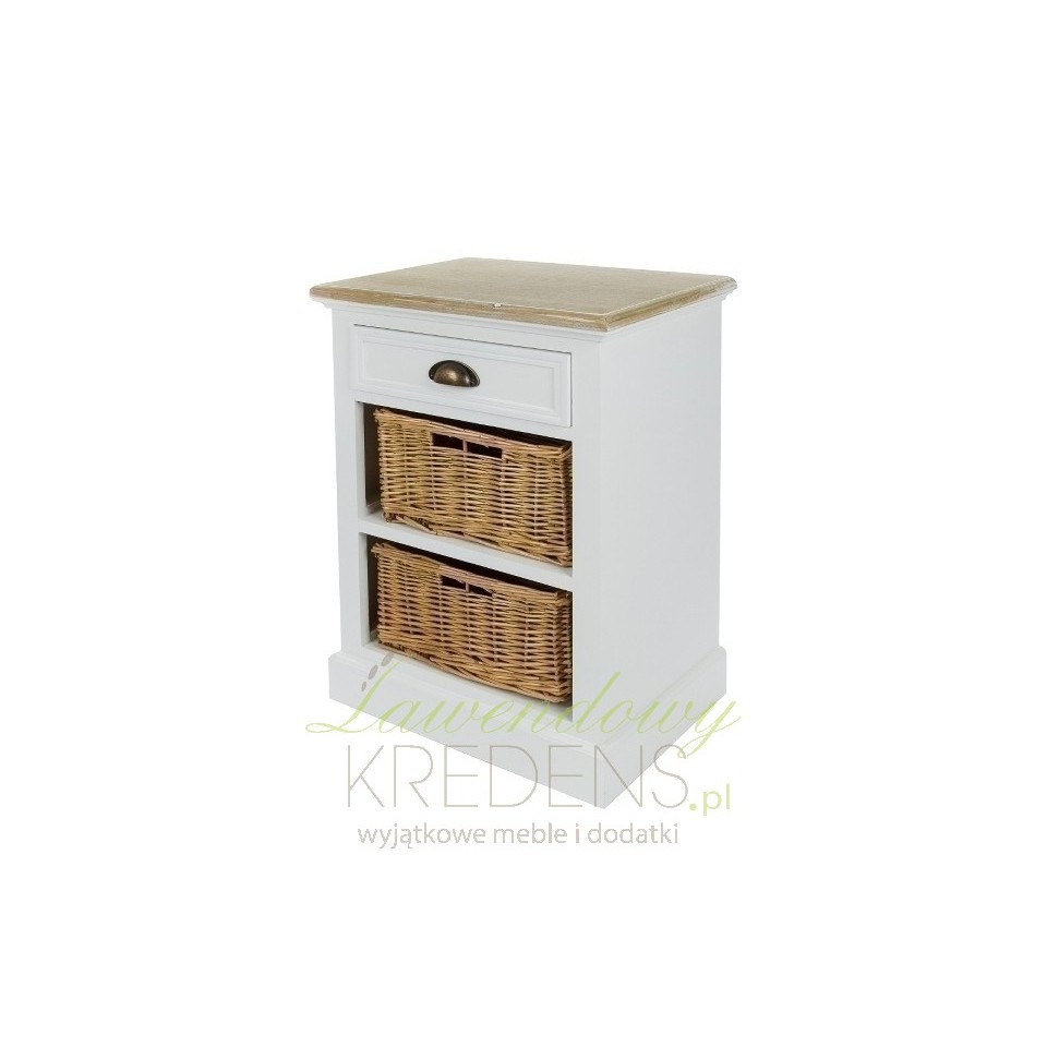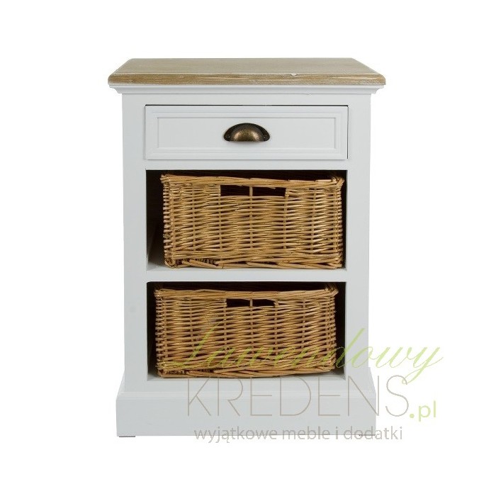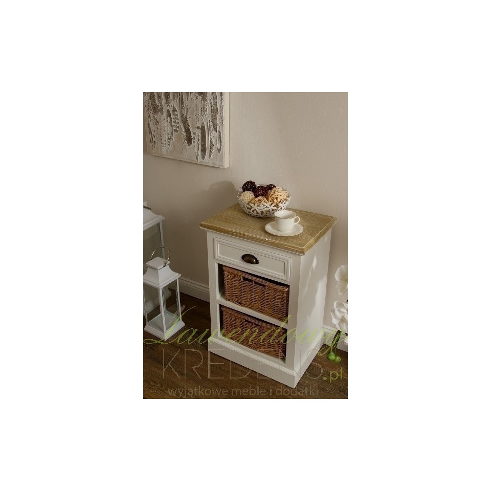 Świetna biała szafka prowansalska wykonana jest z solidnego drewna w kolorze białym i brązowego blatu. Szafka nocna pochodzenia niemieckiego posiada na górze jedną szufladkę na niezbędne akcesoria, a pod nią znajdują się dwa spore kosze wiklinowe. Szafka marki Riviera będzie pięknie wyglądać w sypialni czy też łazience. Meble prowansalskie to godne polecenia trwałe i praktyczne meble!
