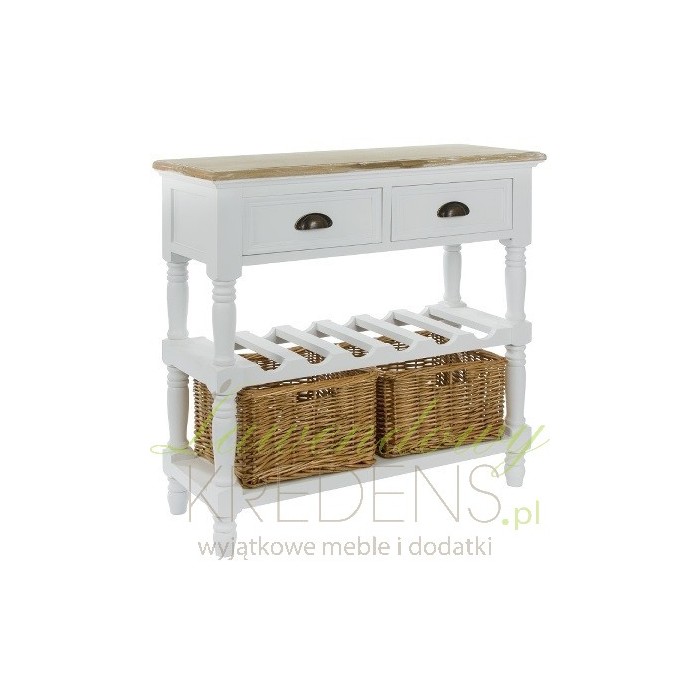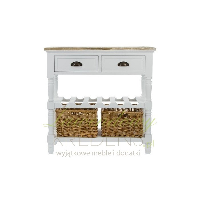 Genialna, biała komoda prowansalska z kolekcji Riviera z półką na wino i dwoma wiklinowymi koszami!