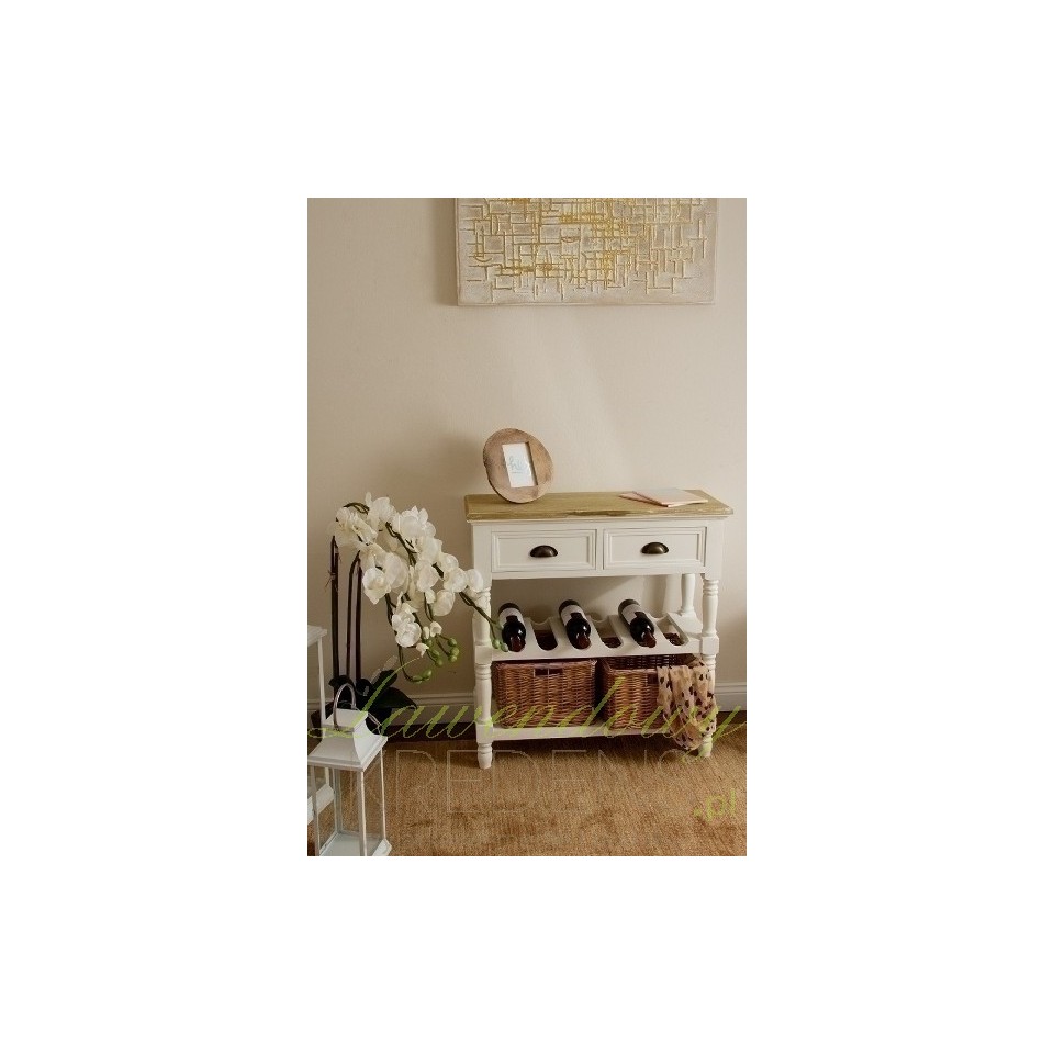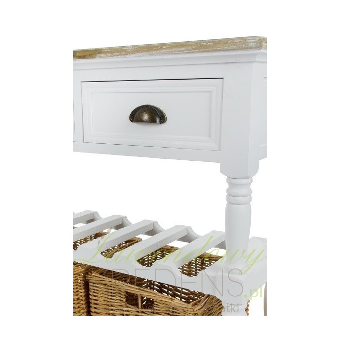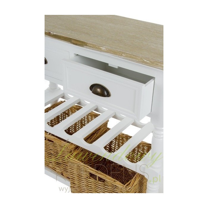 Komoda na wino pochodzenia niemieckiego wykonana została z dobrej jakości drewna w kolorze białym i brązowym. Komoda prowansalska posiada na górze dwie szufladki, a pod nimi półkę na wino i dwa wiklinowe kosze na niezbędne akcesoria. Przepięknie prezentuje się wraz z kolekcją Riviera, tworząc wyjątkową i niepowtarzalną całość. Meble w stylu prowansalskim każdy chciałby mieć w swoim domu!