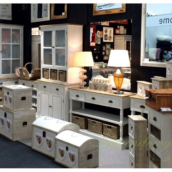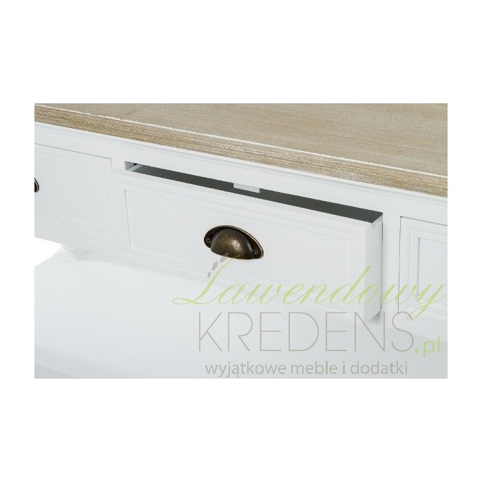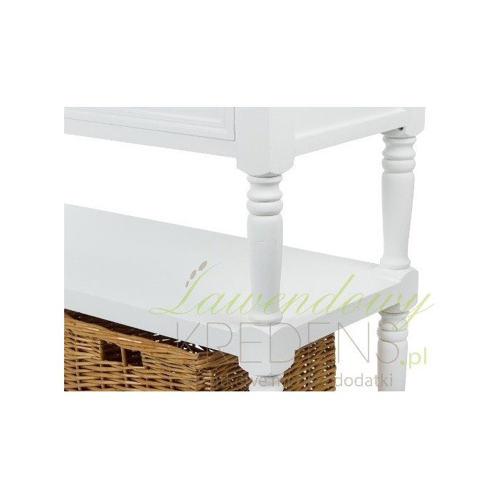 Nieopisanej urody prowansalska konsola w półką, która pomimo ustawienia na dość wysokim cokole półki poprzedzielane ma kształtnymi filarkami. Prezentowana konsola wyróżnia się nie tylko drewnianym blatem na tle białej powierzchni, ale także wspaniałymi koszyczkami, które można swobodnie wyciągać! Genialne meble prowansalskie to nasza specjalność!