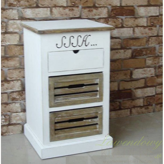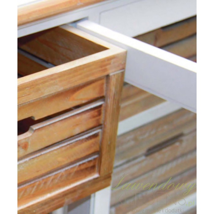 Niesamowicie efektowna szafka prowansalska w kolorze białym z zauważalnymi elementami w kolorze naturalnego drewna z delikatnymi bieleniami. Bielenia na specjalnych szafkach potęgują poczucie naturalności, a napis na górną szufladą świetnie dopełnia kompozycję! I wiesz, że meble prowansalskie to meble stworzone dla Ciebie!
