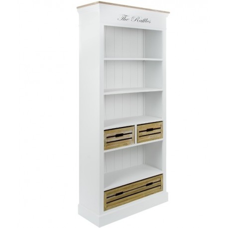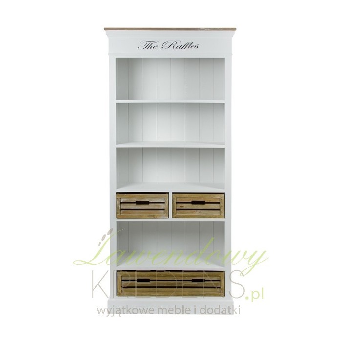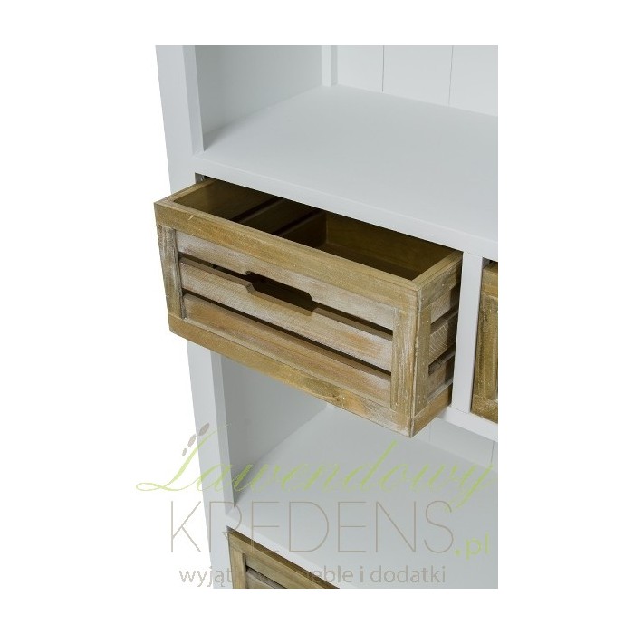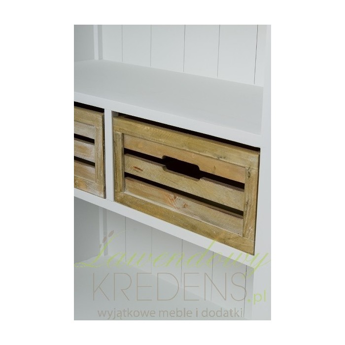 Regał w stylu prowansalskim to pojemny mebel z szufladami w formie drewnianych pudełek oraz z półkami.