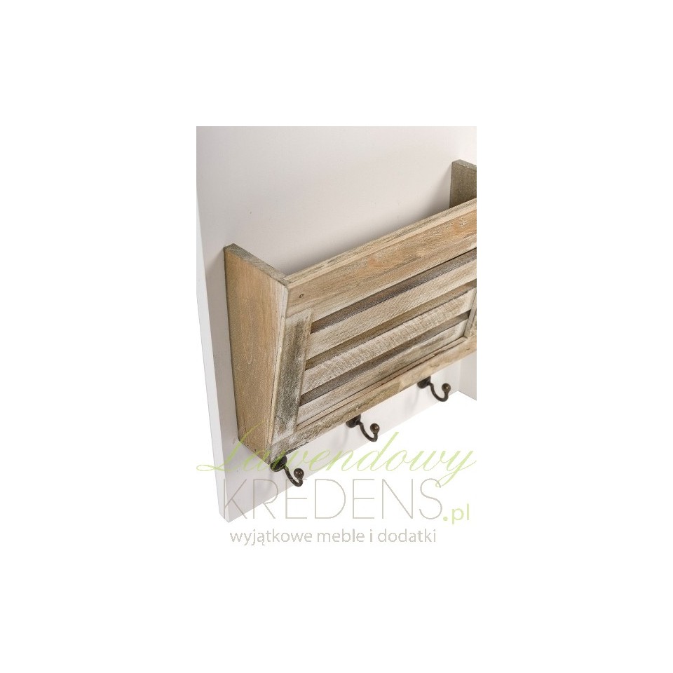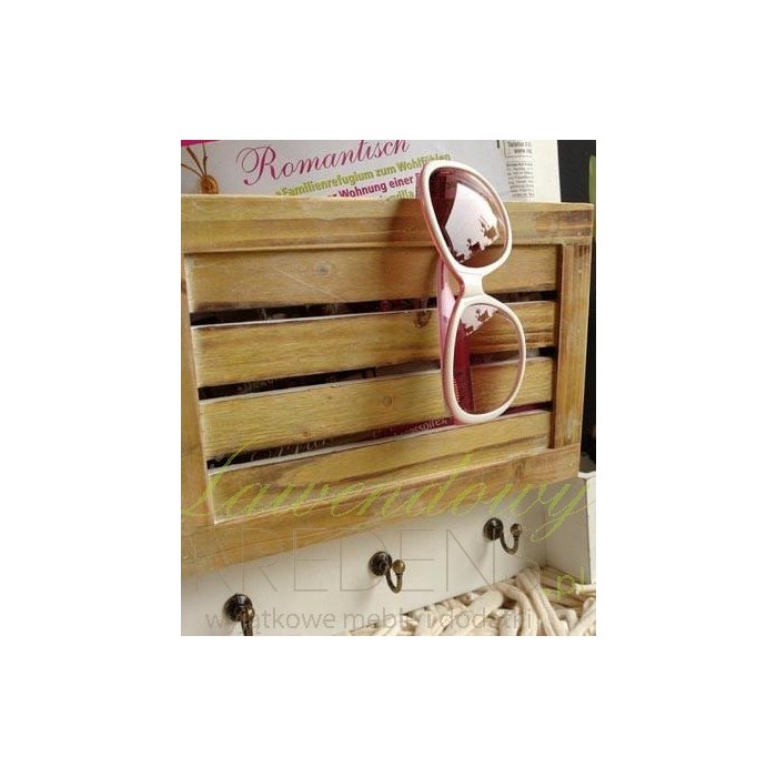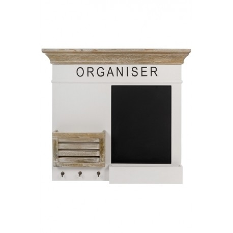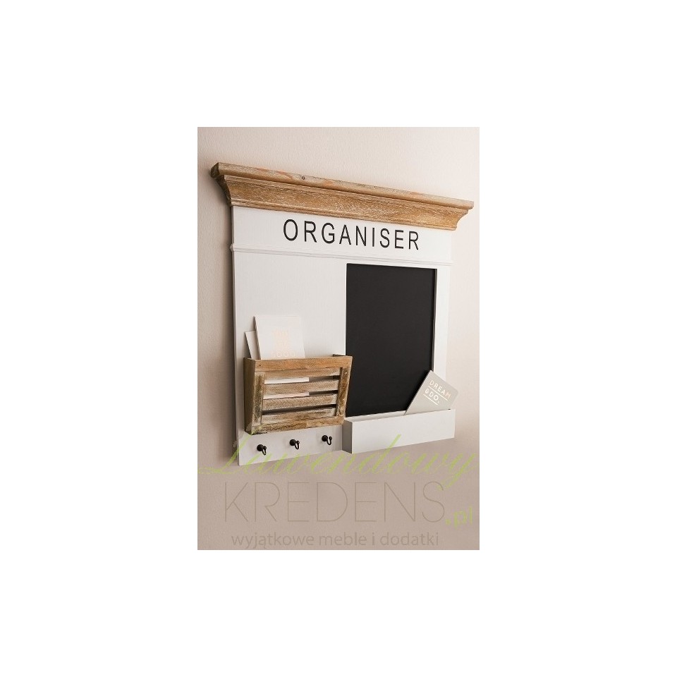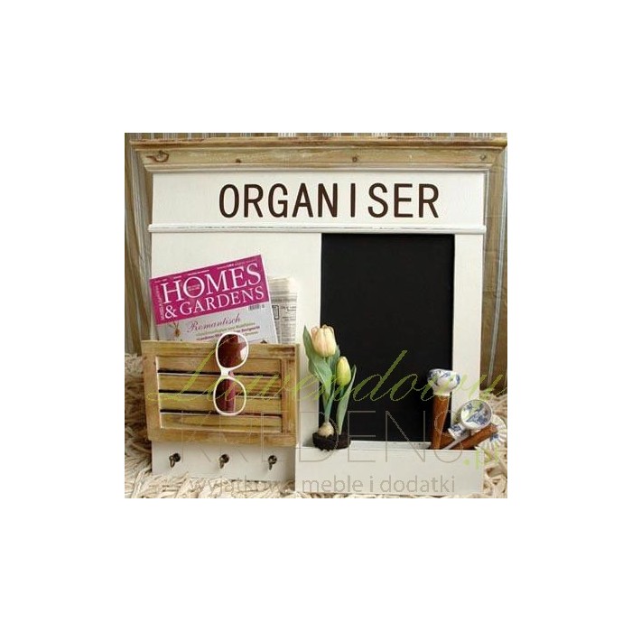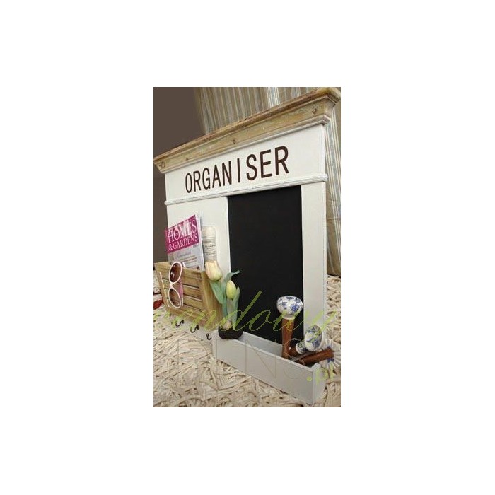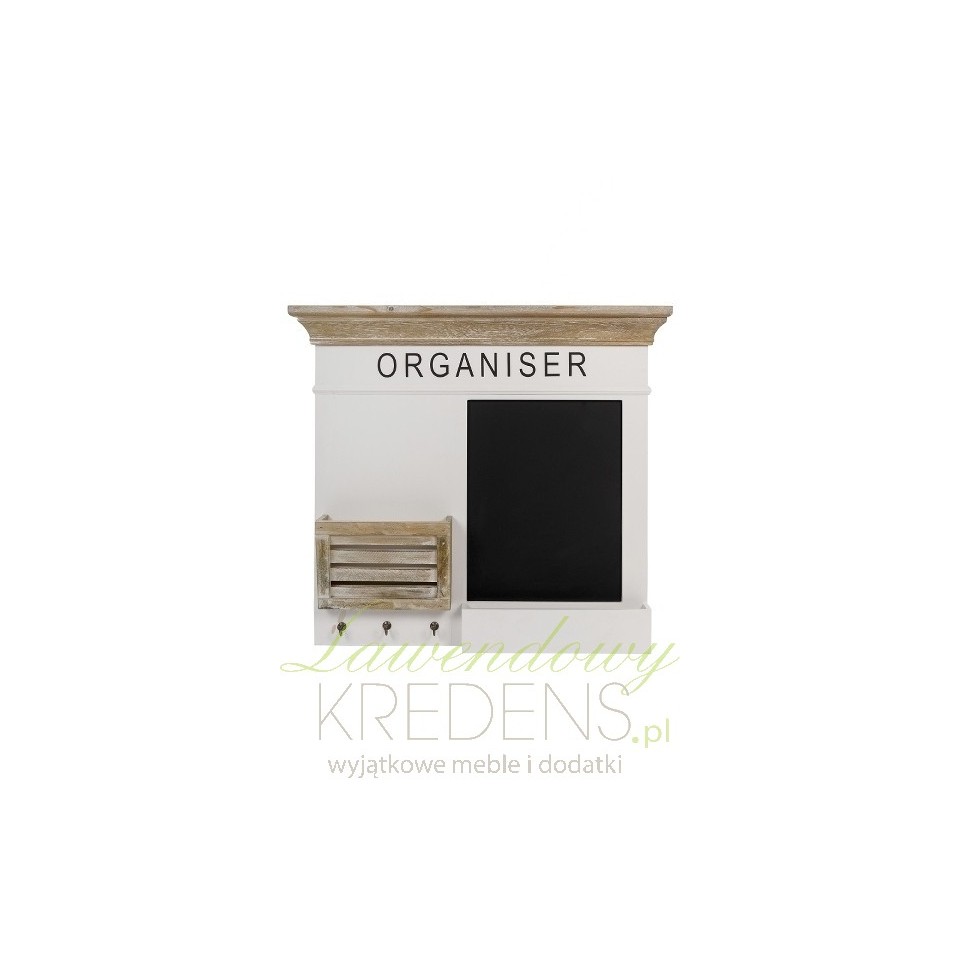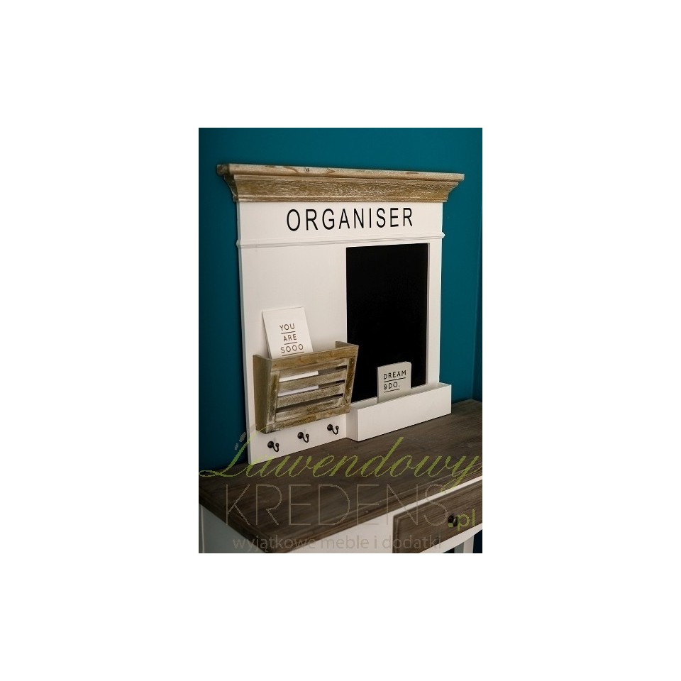 Meble w stylu prowansalskim zaskakują swoją pomysłowością i niebanalnością. Przed Państwem tablica prowansalska marki Riviera w kolorze białym i brązowym. Z prawej strony znajduje się mała tablica do pisania kredą z pojemnikiem na przybory, a z lewej miejsce na dokumenty, a pod nim trzy małe wieszaczki. Całość ozdabia czarny duży napis ORGANISER.