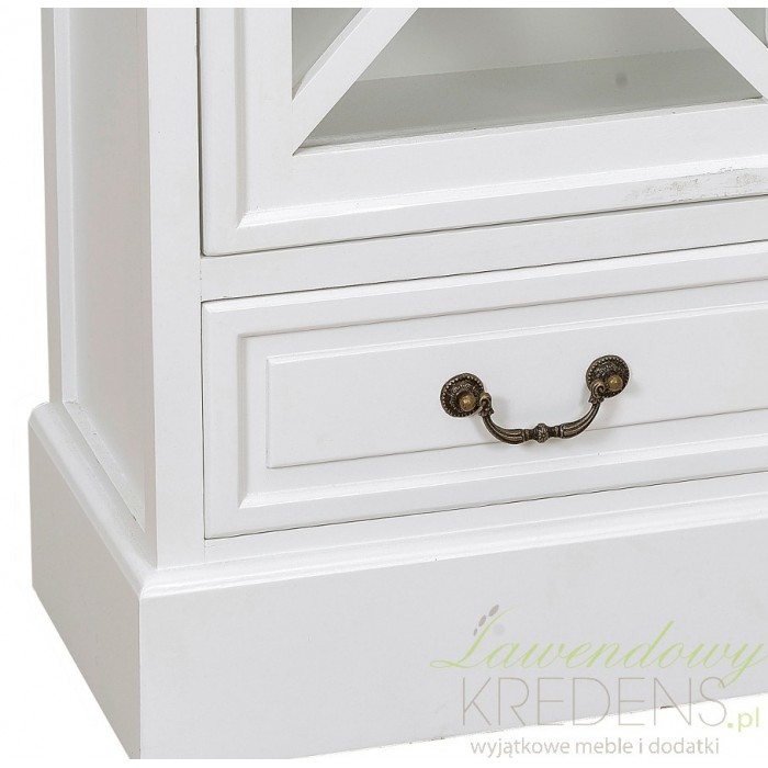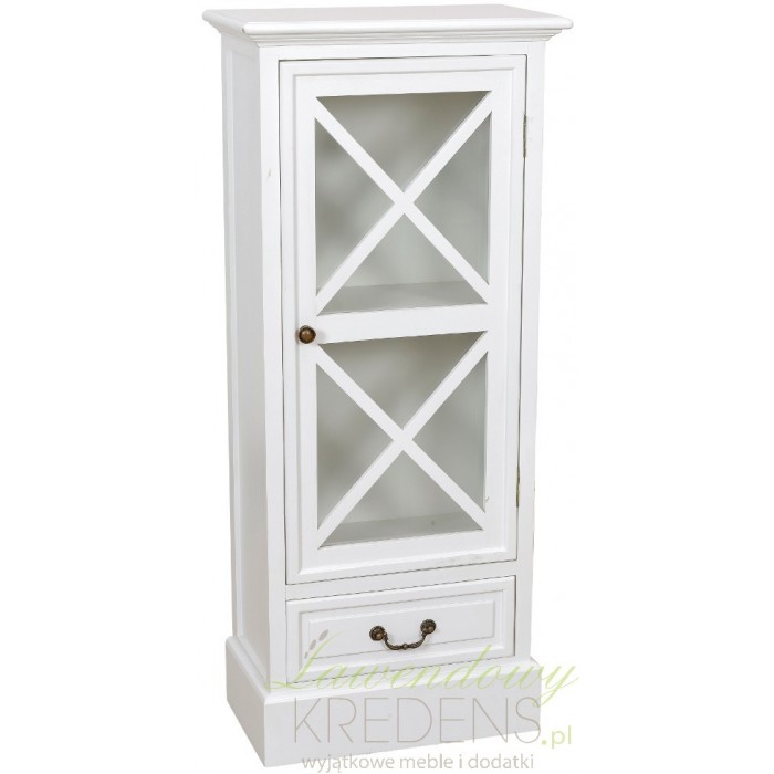 Biała witryna z kolekcji Riviera 1 to doskonały przedmiot dekoracyjny do pokoju. Witryna prowansalska jest w kolorze białym i posiada dużą, otwieraną szafkę z jedną półką, a na dole szufladkę. Drzwi do szafki mają nietuzinkowy, oryginalny wzór. Meble w stylu prowansalskim to wyjątkowe rozwiązania do domu. Zapraszamy do zakupu!
