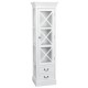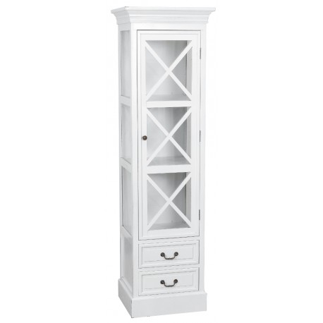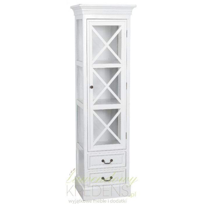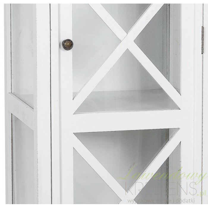 Dekoracyjna witryna prowansalska z przeszkleniami po trzech stronach, które w sposób subtelny pokazują zawartość wWidok ten dzięki dodatkowym listewkom nie jest jednak oczywisty i ostantacyjnie rzucający się w oczy. Dodatkowo biała witryna posiada dolne szuflady z wygodnymi uchwytami do otwierania, w których skryjesz prywatne przedmioty.