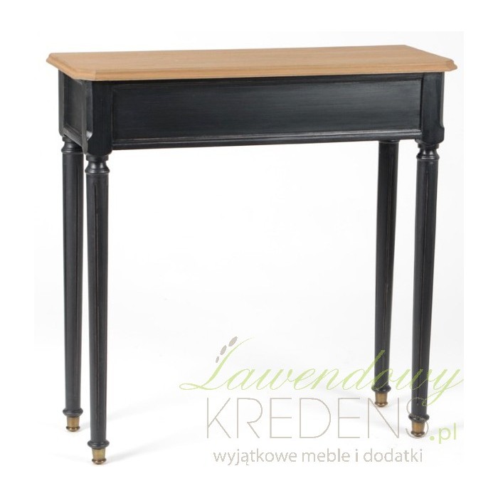 Dosyć wysoka, bardzo elegancka komoda prowansalska, wykonana z twardego drewna pomalowanego na czarno. Jedynym jasnym elementem jest prostkątny blat, który został dzięki takiemu zabiegowi doskonale wyeksponowany. Konsola nie posiada szufla, co sprawia, że jest lekka i tym samym wygodnie poręczna!