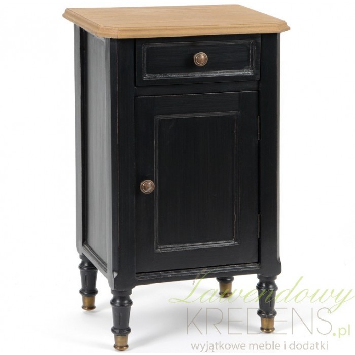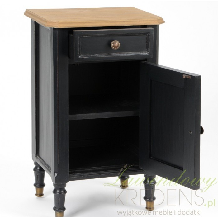 Wytworna szafka nocna, pokazująca jak czarne mele w klimacie prowansalskim wspaniale prezentują się także w sypialni. Niecodzienny kontrast pomiędzy ciemną powierzchnią podstawy, a jasnym, drewnianym blatem to niebanalny sposób na ożywienie wnętrza. Zamykane półki i szuflada pod blatem będą użyteczne przed snem, gdy będziemy odkładać książkę czy okulary!