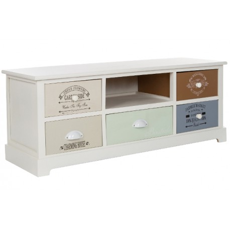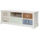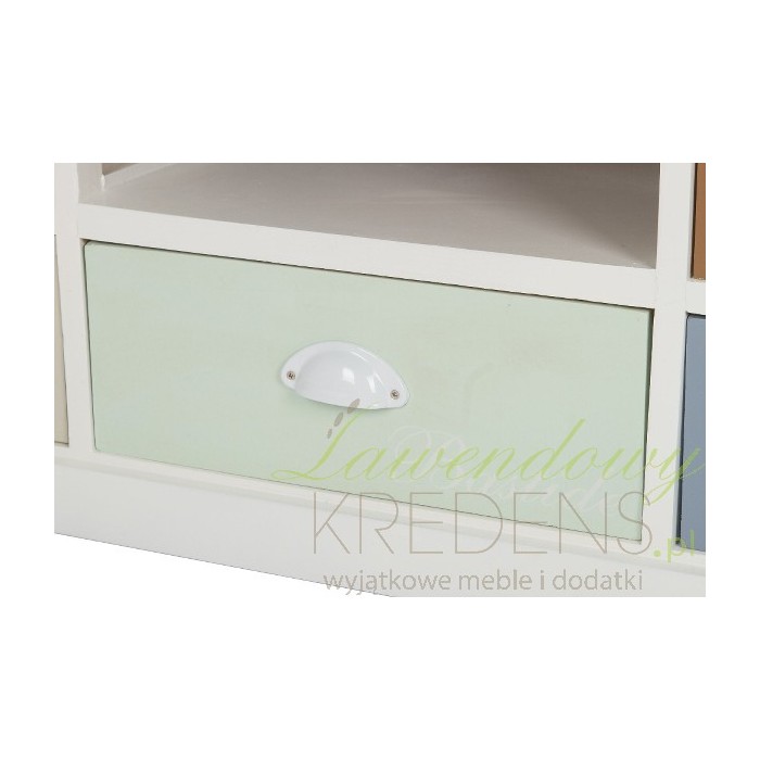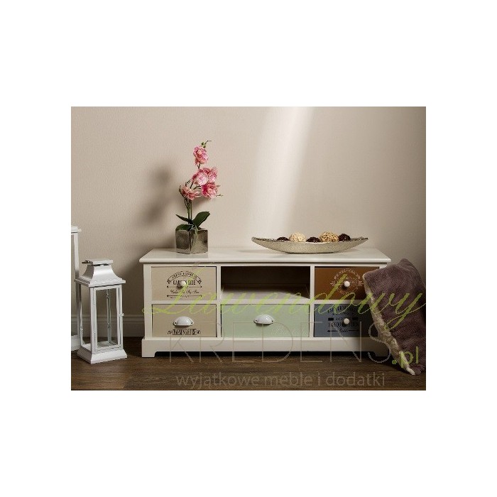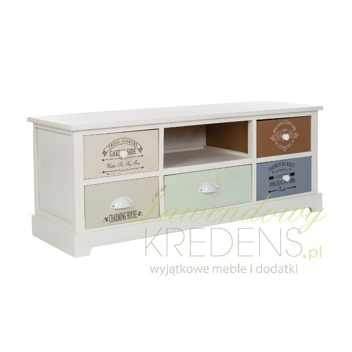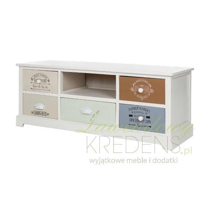 Szeroka komoda z kolorowymi szufladami, któe pięknie eksponują białą powierzchnię mebla! Odważ się i zmień wnętrze na lepsze! Komoda posiada dwa otwory na kable.