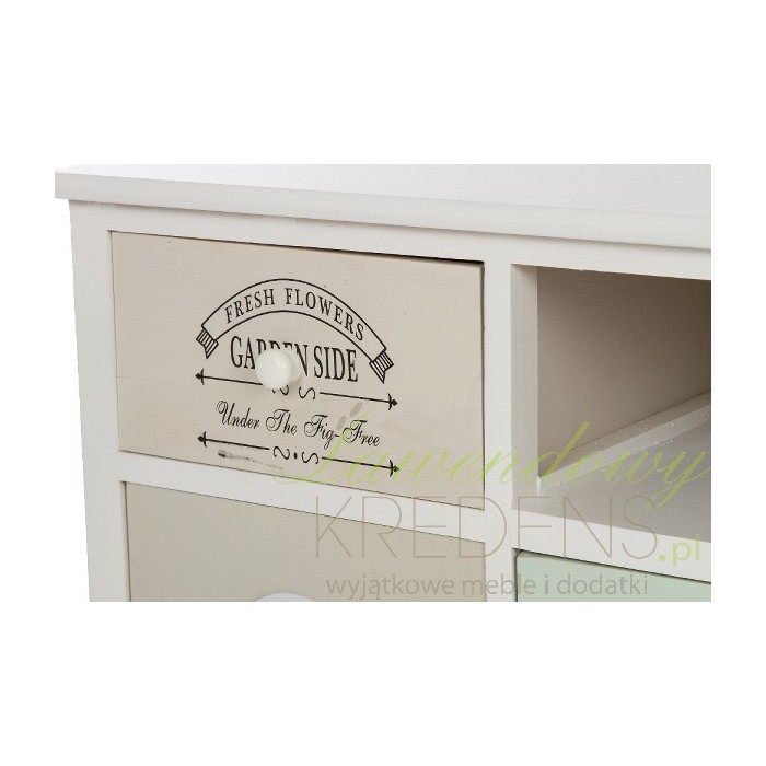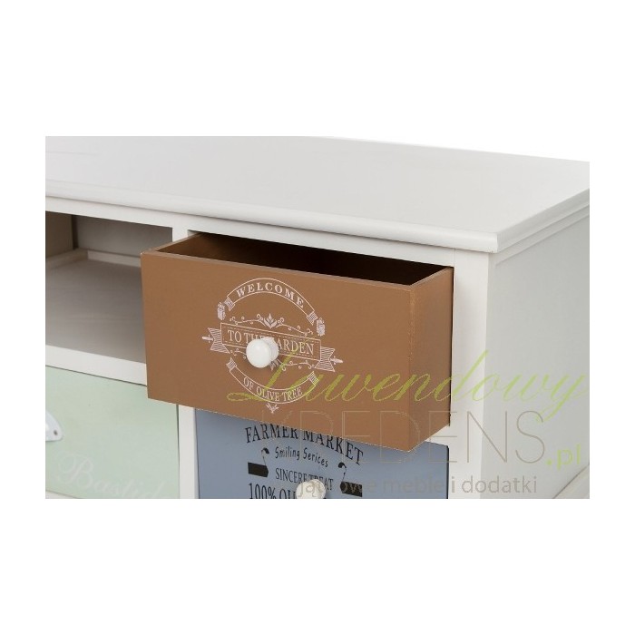 Niska komoda wyposażona w liczne szuflady z kolorowymi frontami, ozdobione napisami w języku angielskim to fantastyczny element wyposażenia wnętrza, który zachwyci funkcjonalością i estetyką. Może stanowić świetne uzupełnienie przedpokoju, nowoczesnej sypialni czy pokoju dla dziecka. Pod tym względem nic Cię nie ogranicza!