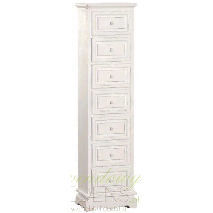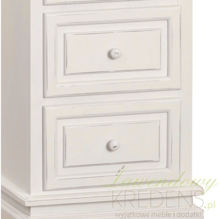 Biała, wąska i wysoka komoda prowansalska z kolekcji Riviera doskonała do twojego mieszkania!