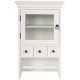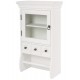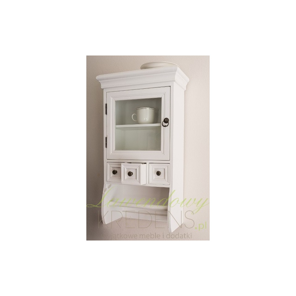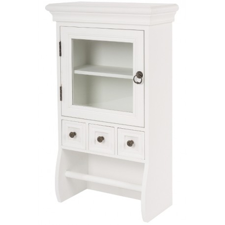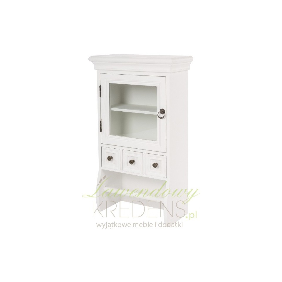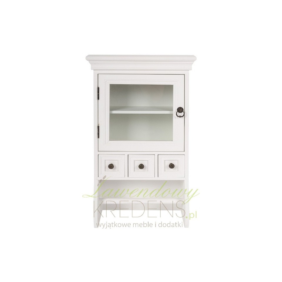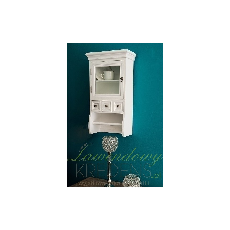 Praktyczna szafka ścienna w kolorze białym, bardzo elegancka i stylowa. Przeszklona szafka w górnej części z wygodnych uchwytem otwierającym ochroni Twoje rzeczy przed kurzem i zapachami, a trze szufladki zapewnią ład i porządek. Dodatkowym atutem jest drążek, na którym można pod ręką powiesić ręcznik czy ściereczkę!
