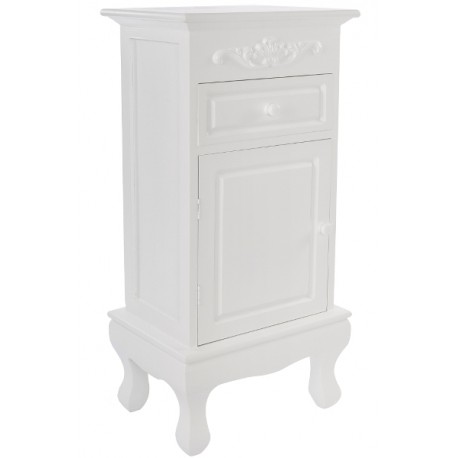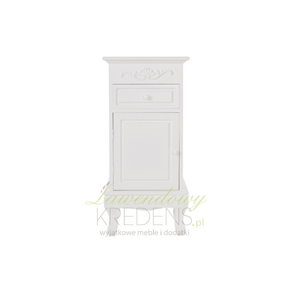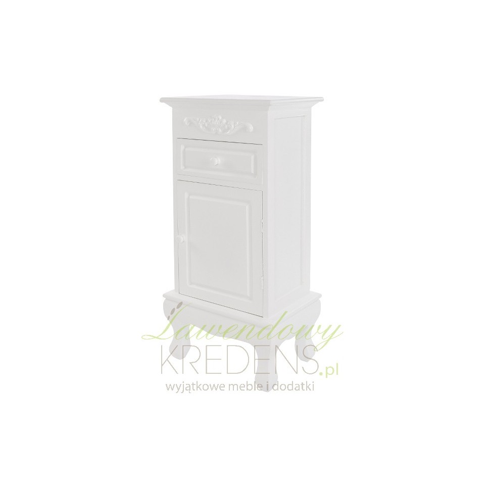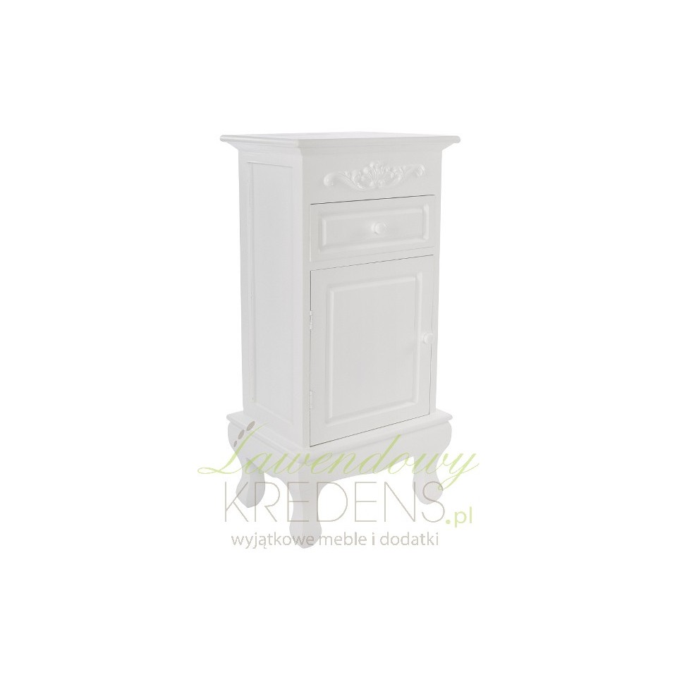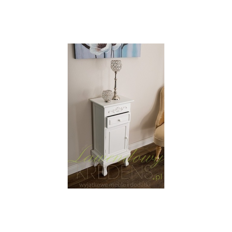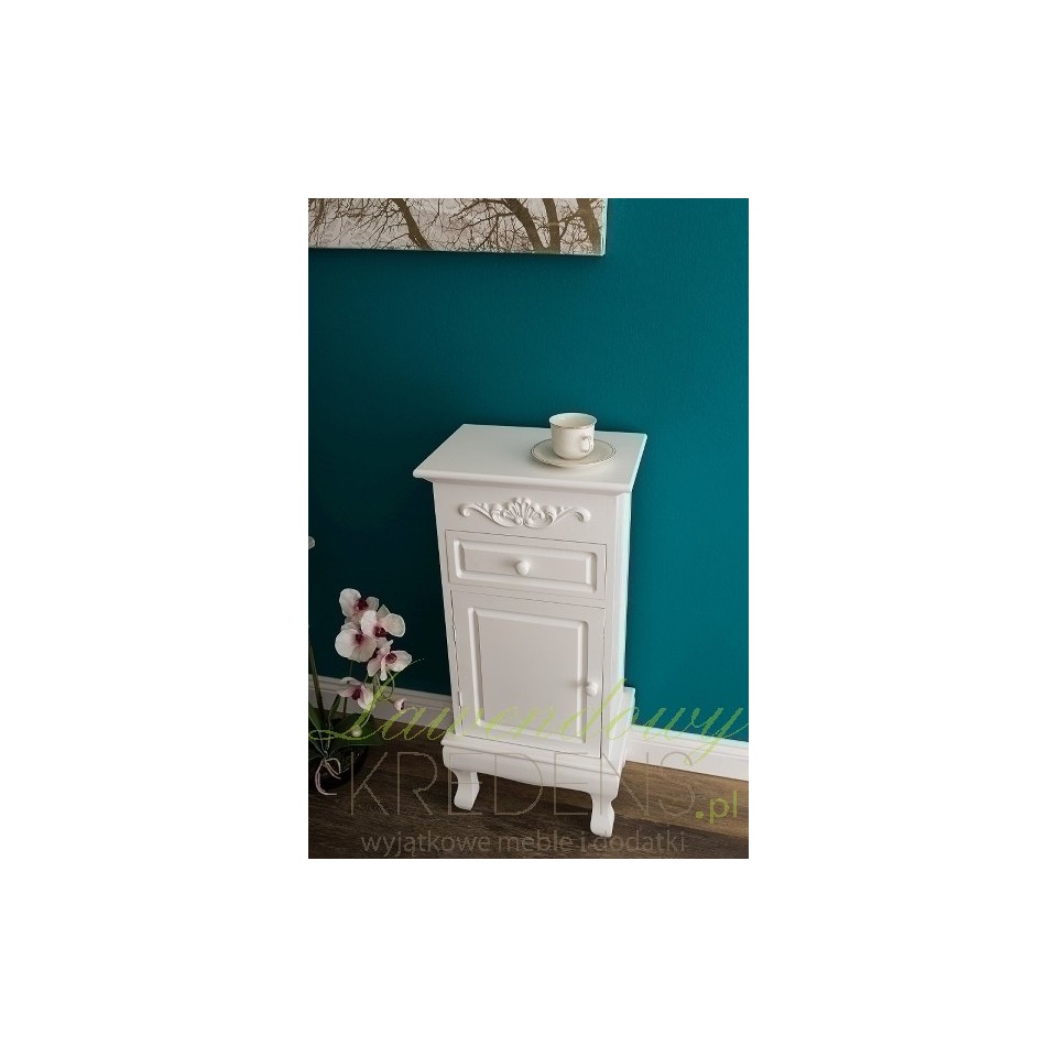Bardzo atrakcyjna , stylowa komoda prowansalska wyposażona w pojedynczą szufladkę i prawostronnie domykane drzwi. Podstawą mebla (dosłownie i w przenośni) są rzeźbione, krótkie nóżki. Komoda w stylu prowansalskim ma też artystyczne rzeźbienie w miejscu pod blatem. Meble prowansalskie w białym kolorze znajdziesz pośród innych elementów wyposażenia wnętrza od niemieckiego producenta.