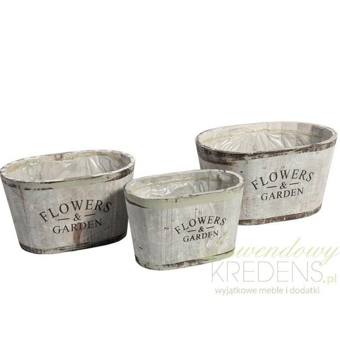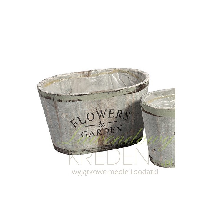 Osłonki drewniane doskonale ochronią twoje kwiaty czy rośliny przed zniszczeniem czy zabrudzeniem. Osłonki w stylu prowansalskim firmy Belldeco wykonane są z drewna i pokryte są wewnątrz nieprzemakalną folią. Mają owalny kształt i przetartą powierzchnię. Z przodu znajduje się ozdobny napis Flowers & Garden.