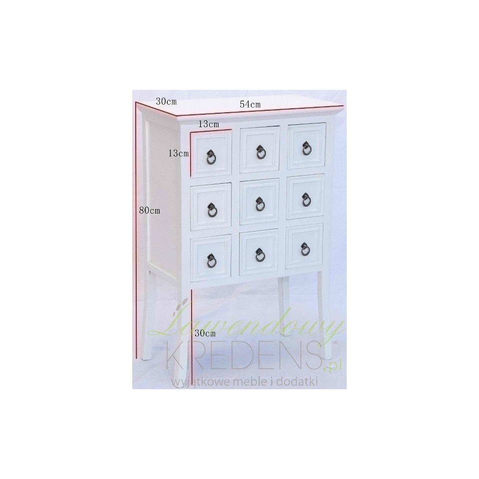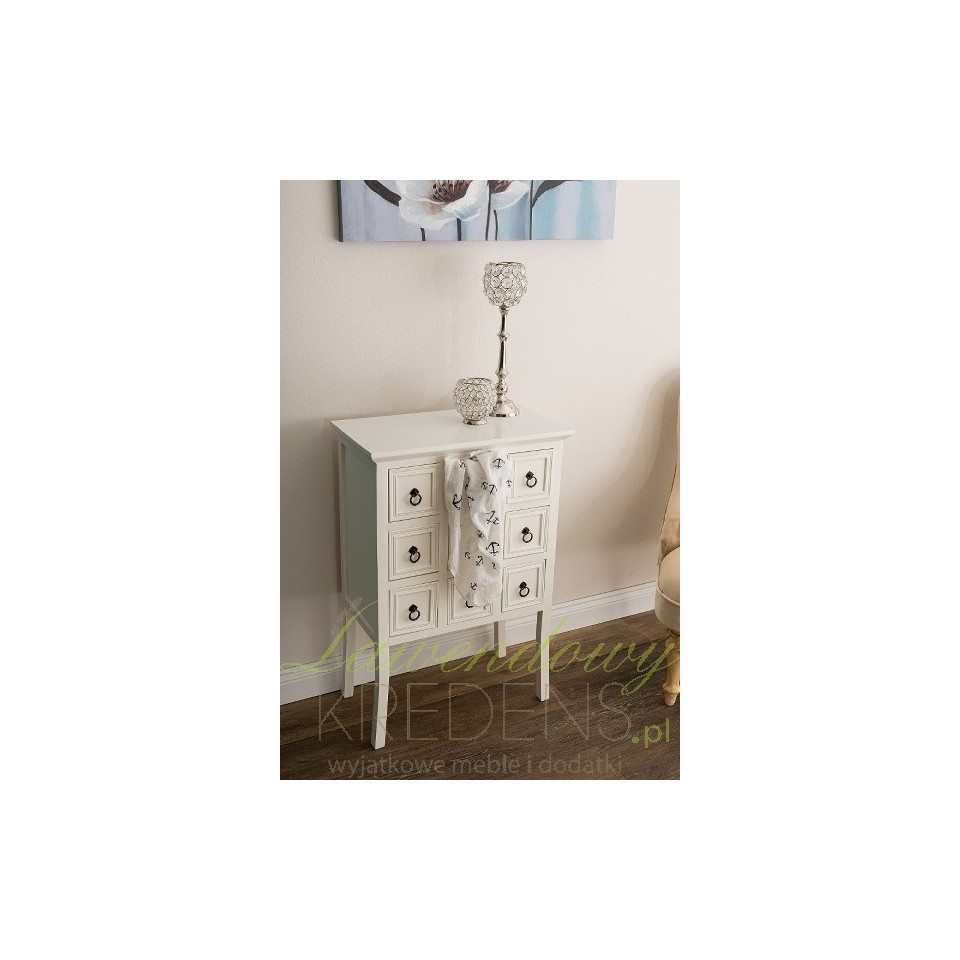 Komoda w stylu prowansalskim idealnie nadaje się na biżuterię. Komoda prowansalska posiada dziewięć małych szufladek z unikalnymi i uroczymi uchwytami. Wspaniale będzie wyglądać w sypialni, wśród mebli z tej samej kolekcji. Meble prowansalskie to przepiękny styl i solidne wykończenie.