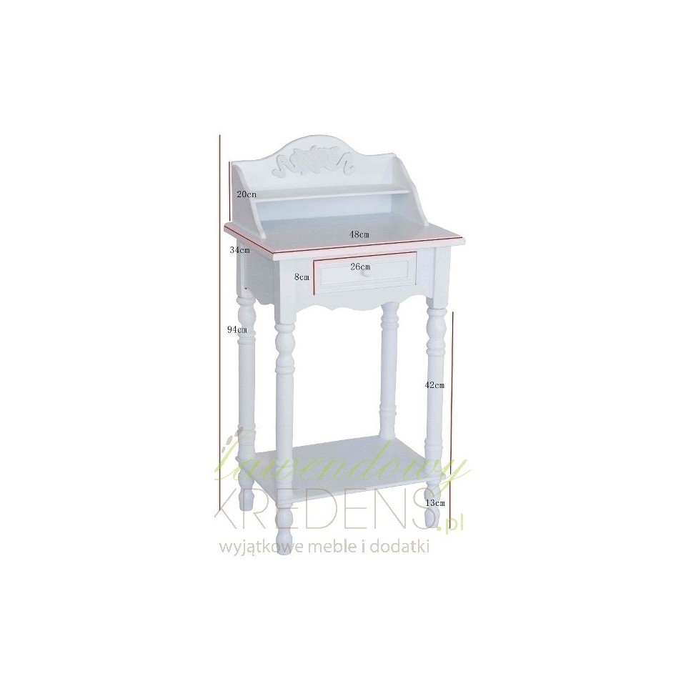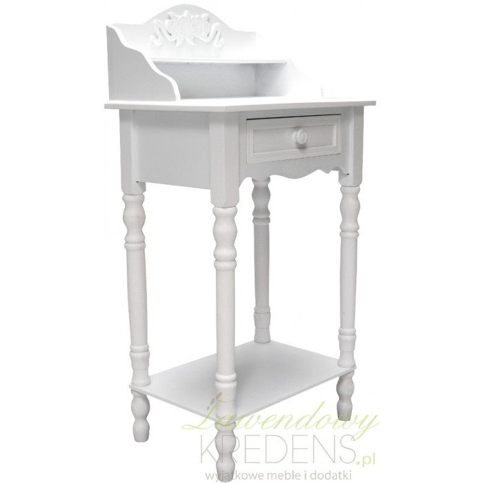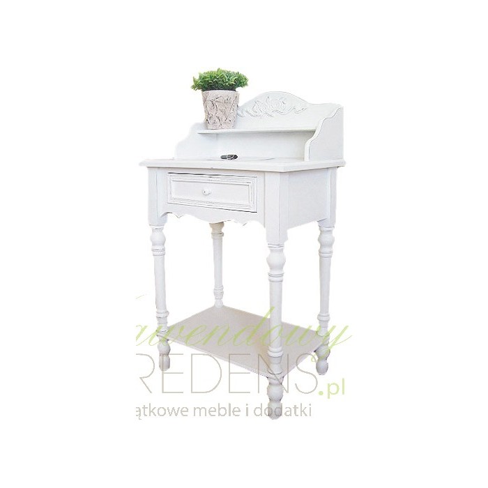 Nawiązujące do zeszłych epok stoliki prowansalskie w kolorze białym z praktyczną szufladą pod blatem i uroczą nadstawką z ozdobnym zakończeniem z motywem kwiatowym. Dzięki wspomnianej nadstawce stoliki prowansalskie bardzo przypominają toaletki, jednak różnica polega na dodatkowej półce w dolnej części, która jest miejscem na nasze przedmioty!