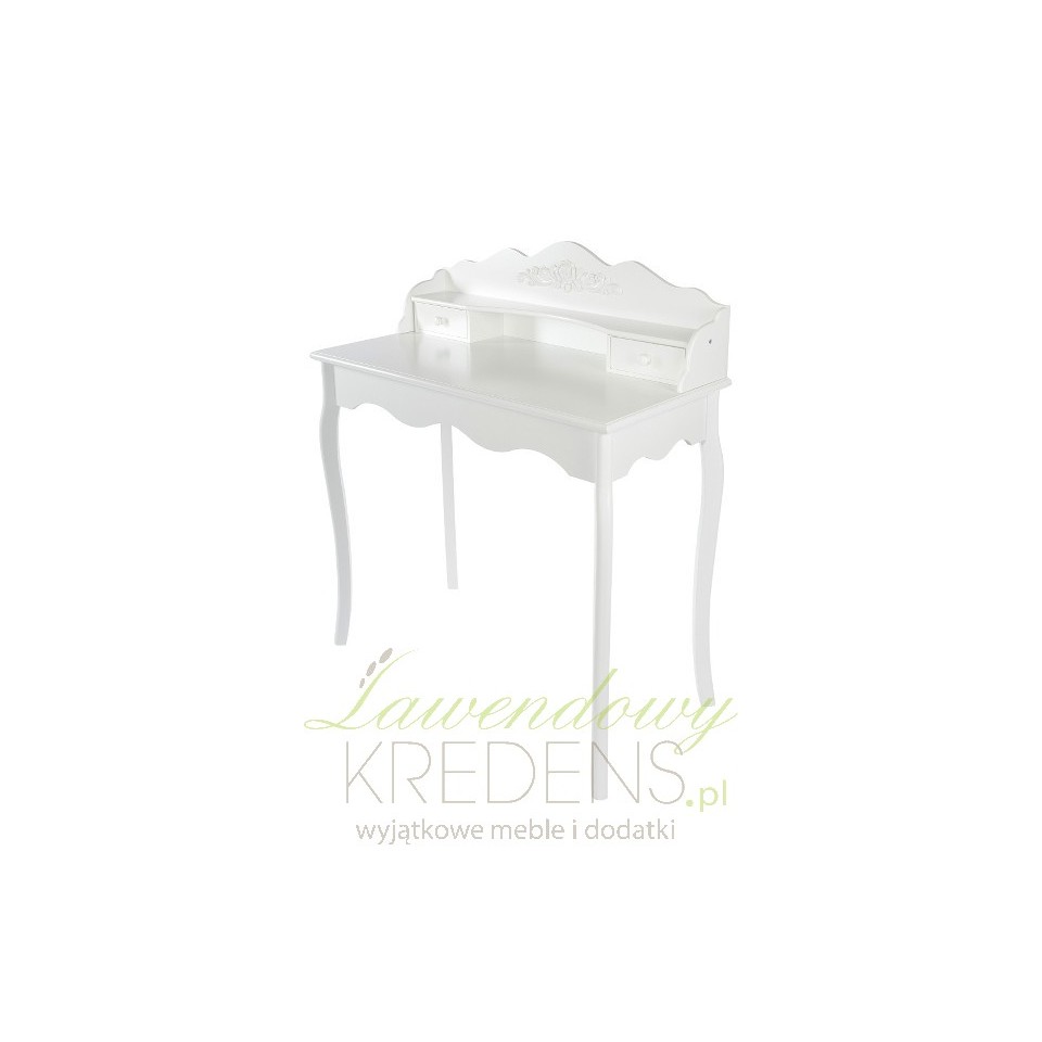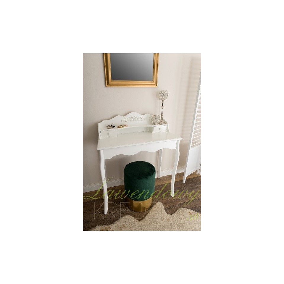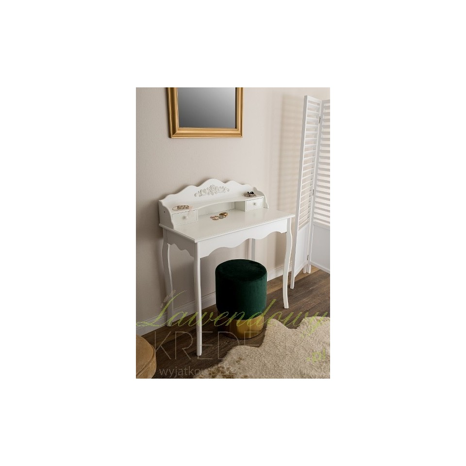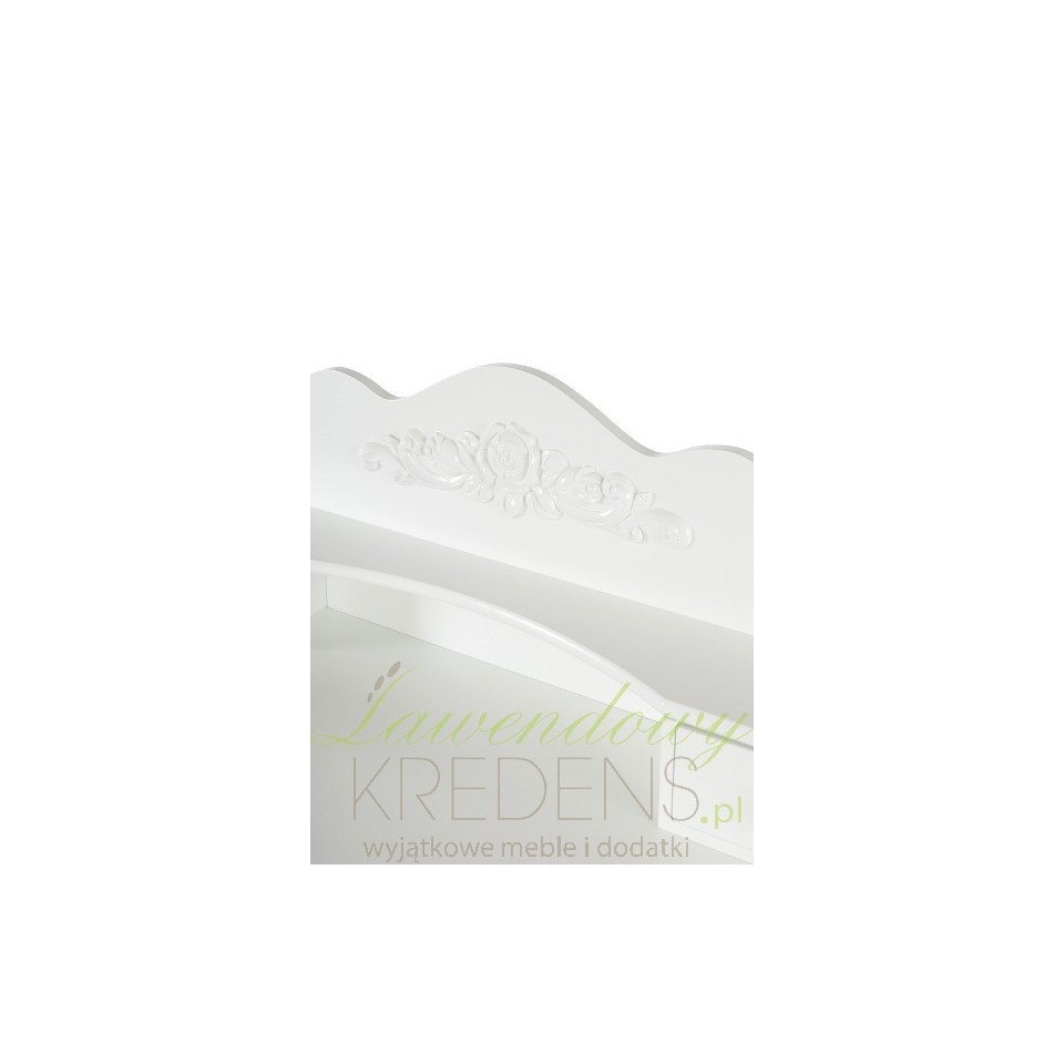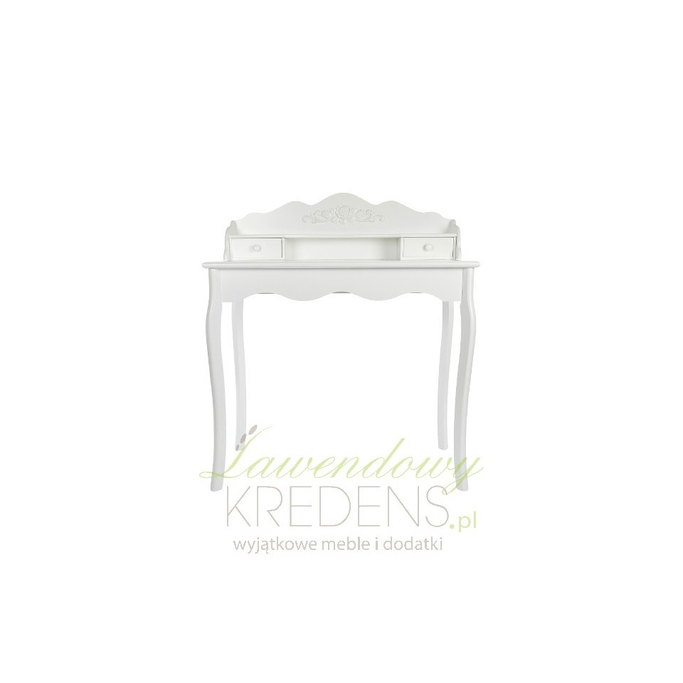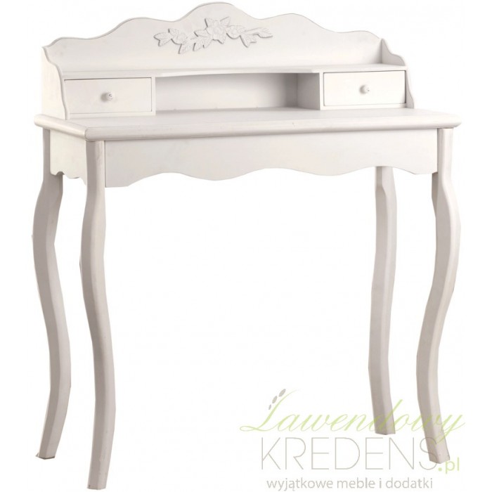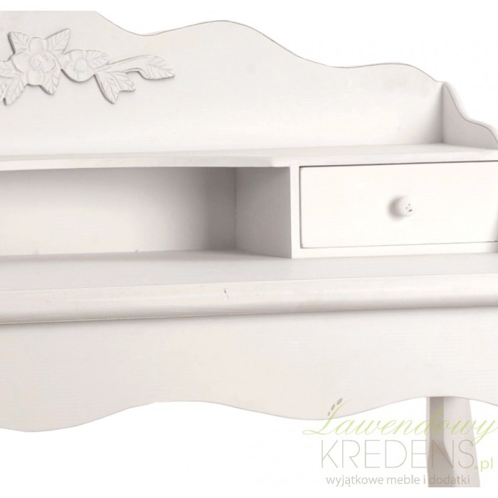Wygodny do pracy, czy nauki biały sekretarzyk w stylu prowansalskim, ustawiony na czterech smukłych nagach. Jego wielką zaletą jest dodatkowa półka nad szufladami oraz tylna zabudowa, na której znajduje się rzeźbiona dekoracja z motywem kwiatowym. Jego wdzięk i uzytecznośc pokochsz od pierwszego wejrzenia!