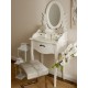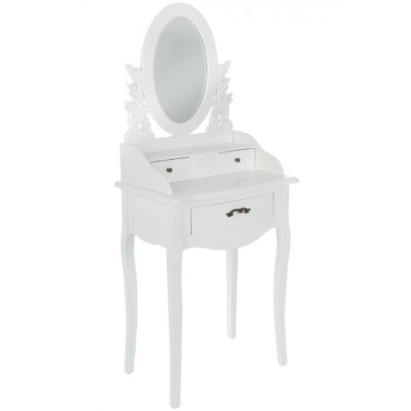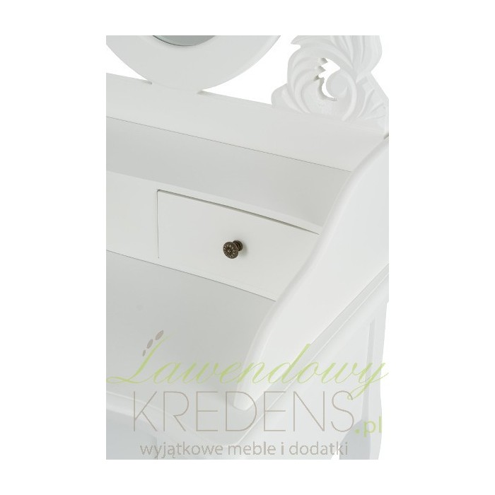 Prezentując meble w stylu prowansalskim z przyjemnością przedstawiamy konsolę z dużym lustrem. Ta biała toaletka posiadając przydatne, pojemne szuflady, wygodny blat oraz umieszczone na podeście owalne lustro to niezastapiony mebel każdego romantycznego, kobiecego wnętrza. Do tego smukła budowa i eleganckie wykończenia świetnie ożywią Twoją przestrzeń! Poczuj się wyjątkowo!