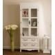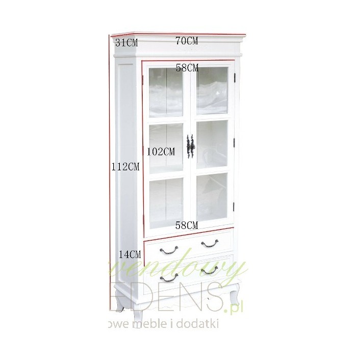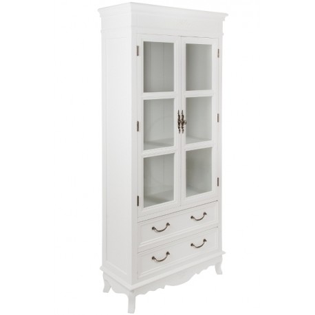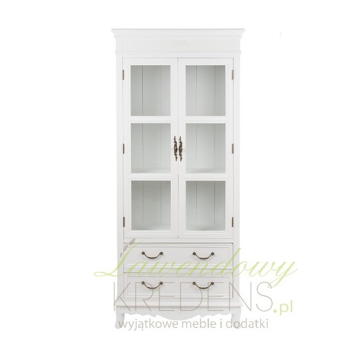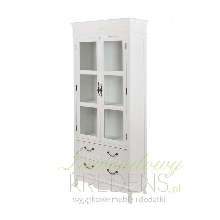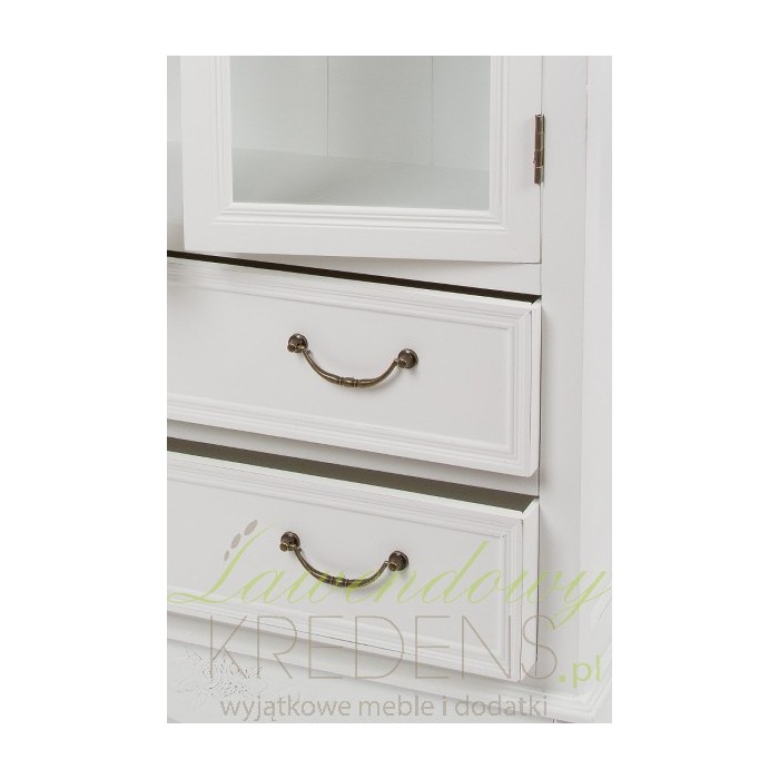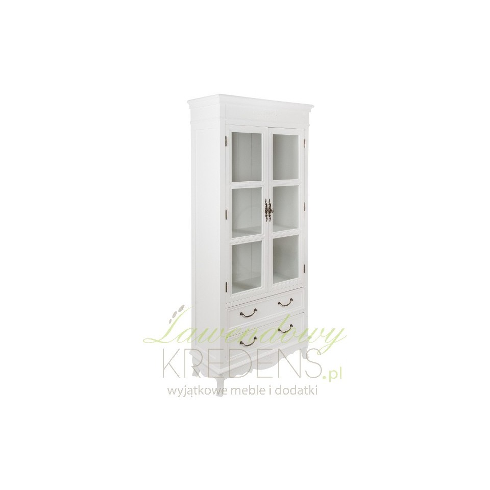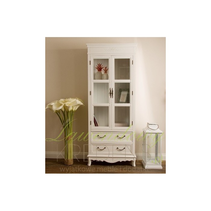 Wysoka witryna prowansalska wyposażona w dwie pojemne szuflady w dolnej części i specjalnie oszklona zabudowę. Sprawdź koniecznie!