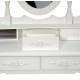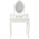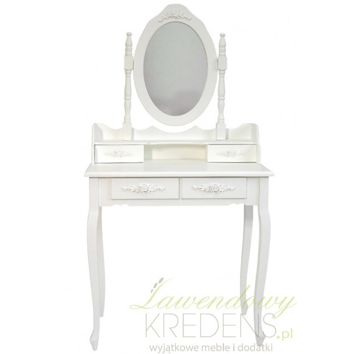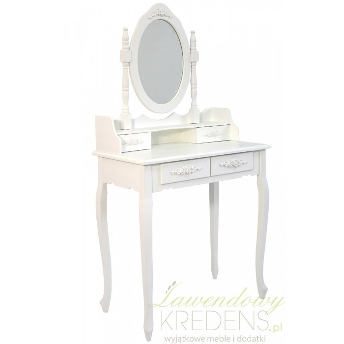 Toaletki Bianca to pełne uroku, białe meble w stylu prowansalskim wykończone pięknymi rzeźbieniami w kształcie róż. W głównej części toaletka posiada dwie szuflady oraz dwie mniejsze szufladki w częśći nadstawki. Lustro toaletki w górnej częśći posiada rzeźbienie nawiązujące to rzeźbień na frontach szuflad.