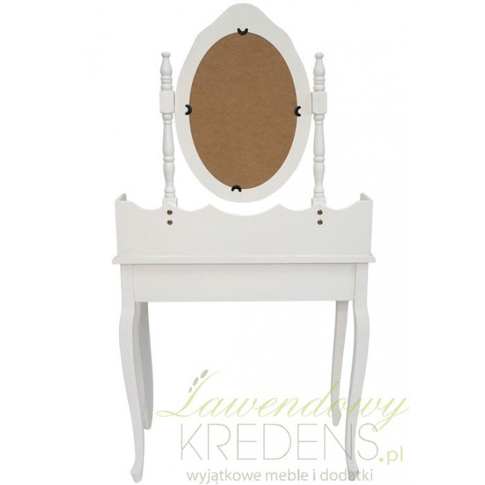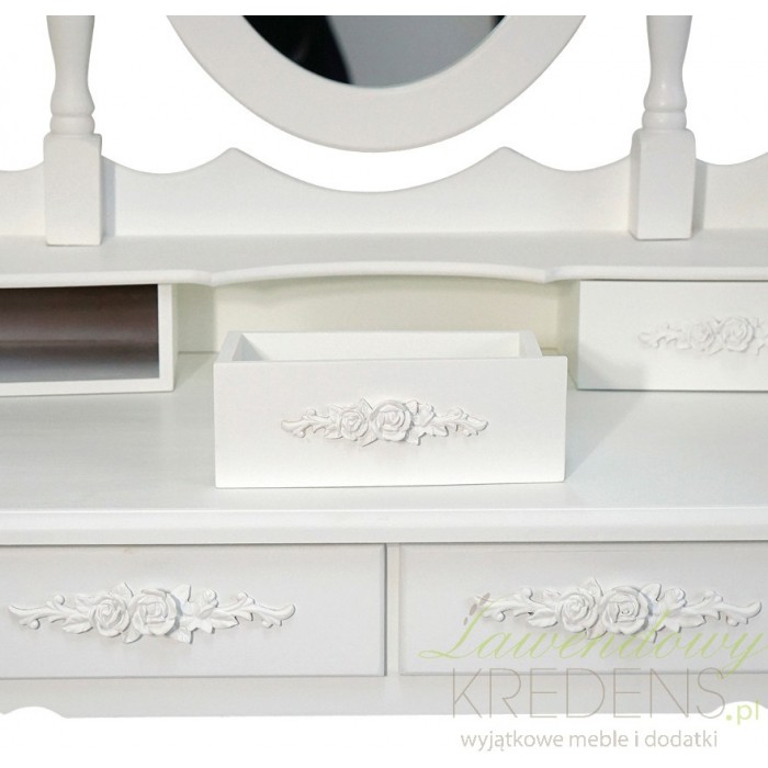 Biała toaletka prowansalska, która zamiast gałek meblowych posiada różyczki z uroczymi rzeźbieniami na około nich.