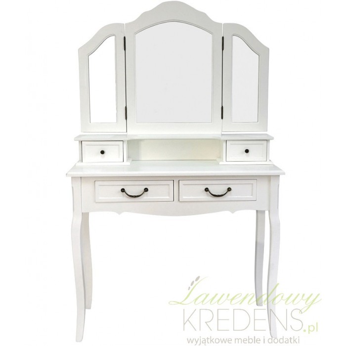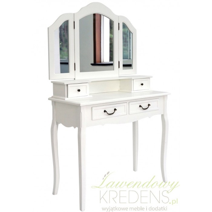 Szeroka, biała toaletka w stylu prowansalskim o jakiej zawsze marzyłaś! Duży blat na kosmetyki i biżuterię, a także cztery szuflady to idealna kombinacja umilająca wnętrze. Ustawiona na czterech smukłych nogach biała toaletka wraz z ozdobnym, zamykanym lustrem to prawdziwy prowansalski skarb, dzięki któremu poczujesz się kobieco.