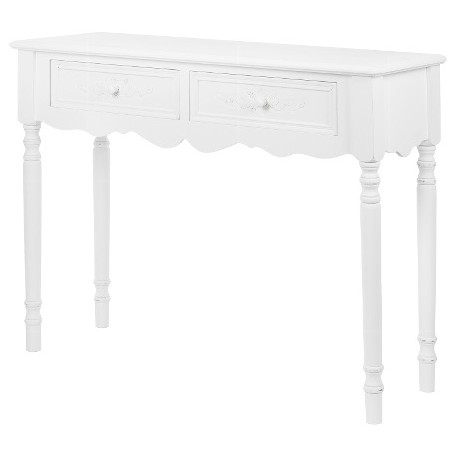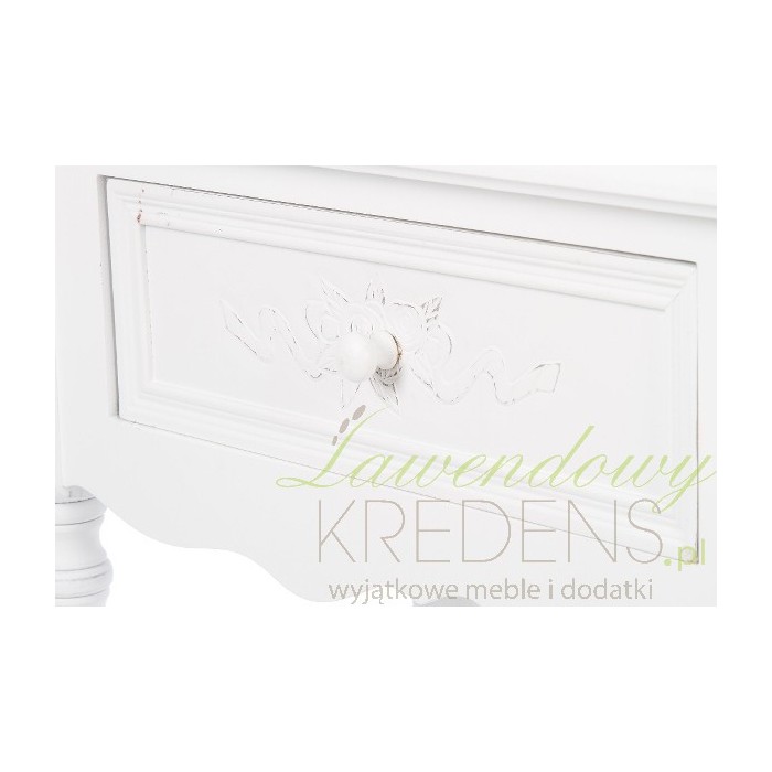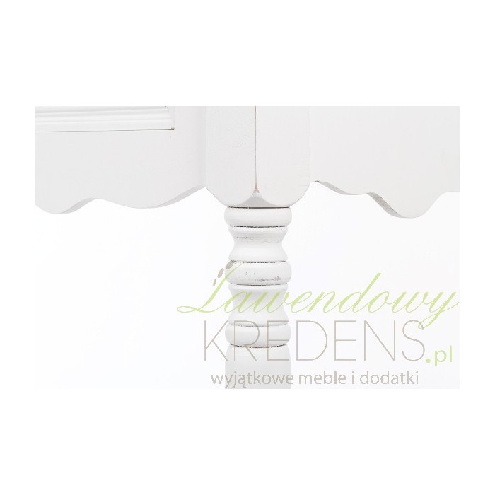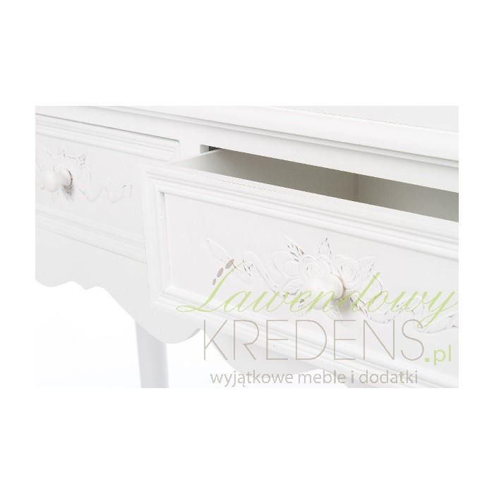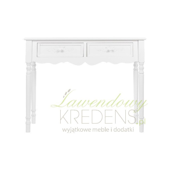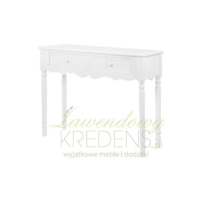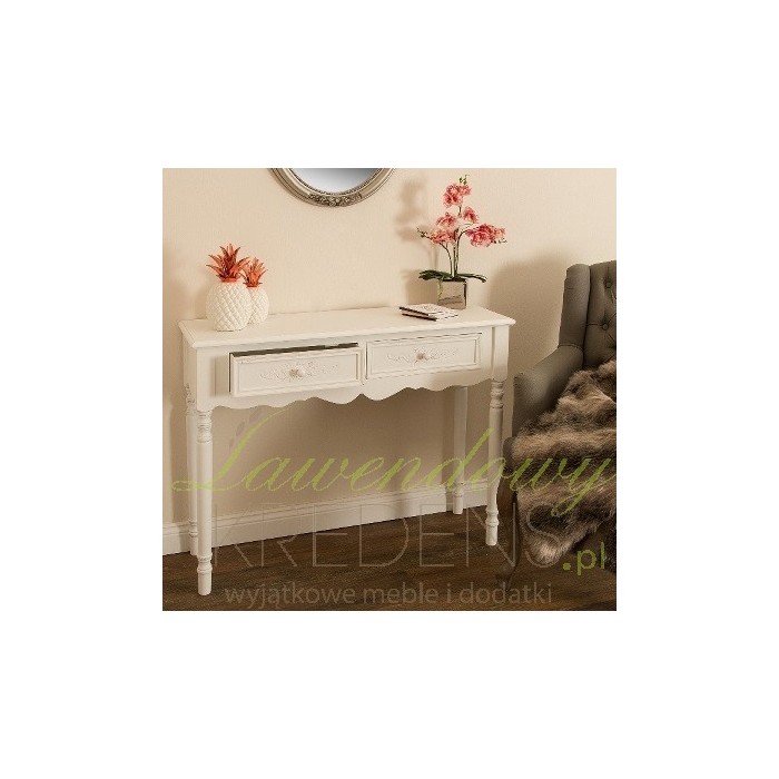 Funkcjonalna konsola z dwiema szufladkami urzeknie Cię delikatnością i stylowym wykończeniem. Biała konsola prowansalska Bianca doskonale wpisuje się w klasyczne i bardziej nowoczesne trendy modowe. Nogi konsoli to rzeźbione słupki, a cokół pod szufladami ma kształt dekoracyjnej fali. Meble prowansalskie wygądają jak prawdziwe dzieła sztuki.