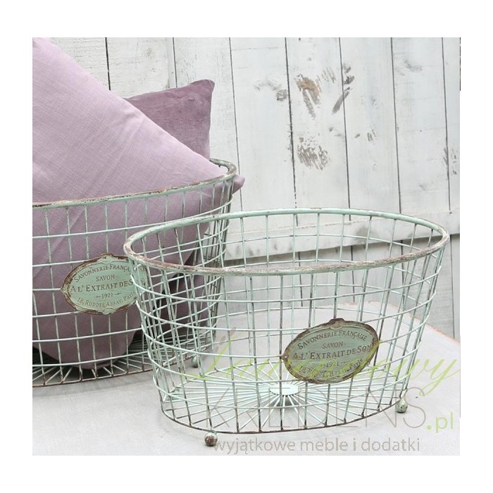 Metalowy kosz w kolorze delikatnej zieleni w odcieniu jasnej mięty, specjalnie postarzany na powierzchni. Będziesz zachwycona!