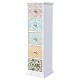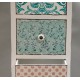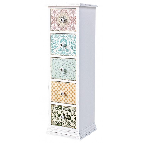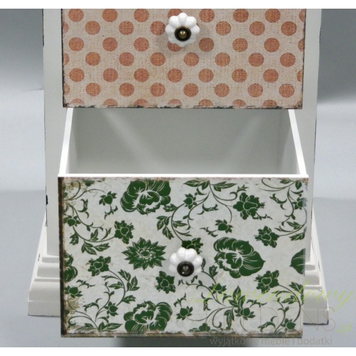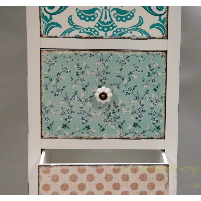 Wysoka komoda z wzorkami, które są doskonałą dekoracją frontów szuflad i fantastycznie nadają meblowi lekkości i wdzięku. Każda szuflada otwierana jest białą gałką meblową, kształtem przypominającą kwiat. Dodatkowo kolorowa komoda została umiejętnie postarzona na krawędziach, co pozwoliło wydobyć jej prowansalski charakter!