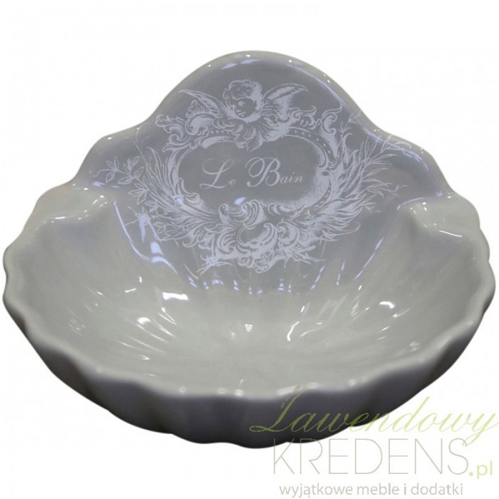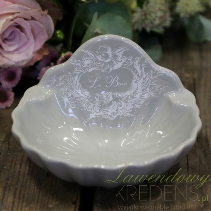 Szara mydelniczka z francuskiej kolekcji Le Bain od marki Chic Antique, przypomina ona kształtem piękną morską muszlę. Dodatki do łazienki z tej cermicznej serii posiadają także ozdobny biały napis.