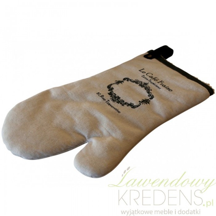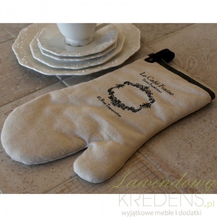 Rękawica kuchenna w stylu prowansalskim jest w kolorze kremowym z czarną obwódką. Na wierzchniej stronie znajduje się francuski napis Le Cafe Fraise i ramka w formie dekoracji. Rękawica pochodzenia francuskiego, firmy Chic Antique doskonale współgra z fartuszkiem z tej samej kolekcji. Polecamy!