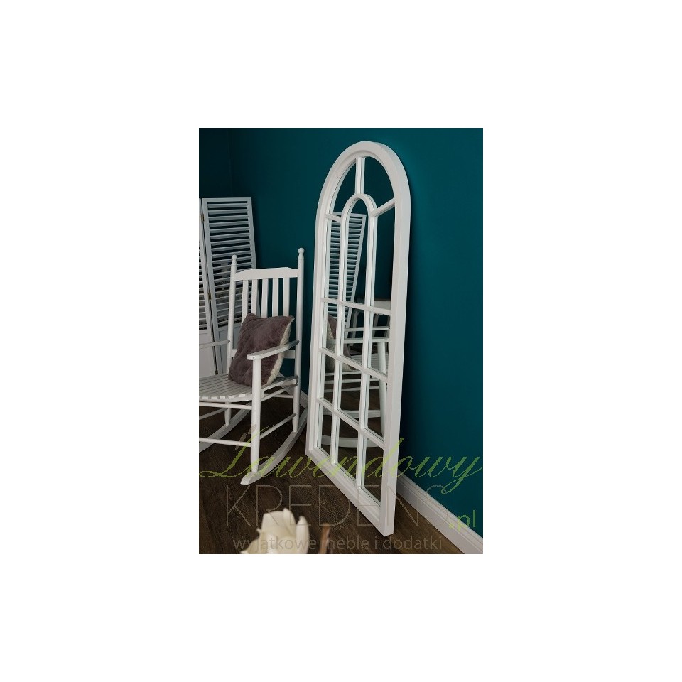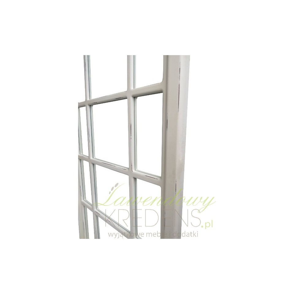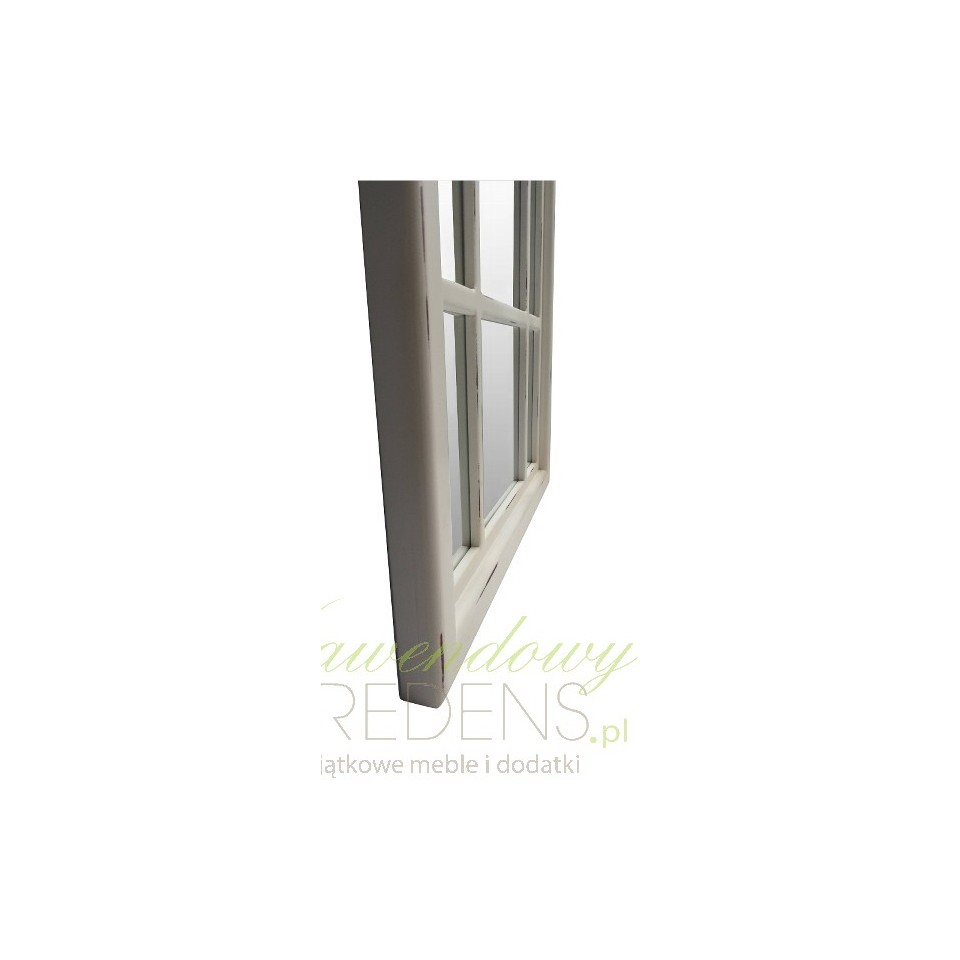 Fantastyczne, wysokie lustro prowansalskie w białej, drewnianej ramie, na której widoczne są delikatne przetarcia mające świadczyć o stylu i odwzorowaniu rzeczywistości. Lustro okno dekoracyjnie wypełni wnętrze, powiększając go optycznie i będąc świetną podstawą do stworzenia miejsca przytulnego i domowego!