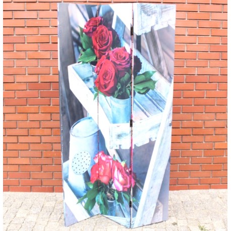 Oferowany Państwu parawan w stylu prowansalskim to praktycznie wielkoformatowy obraz z przepięknie prezentującymi się czerwonymi różami na drewnianym stojaku w tle z metalową konewką. Fantastyczny mebel przenośny, który można dowolni i w każdej chwili włożyć i schować, aby mieć więcej przestrzeni!